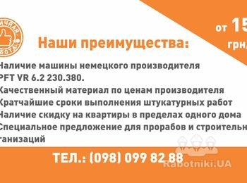 Машинное нанесение штукатурки – один из способов быстро, аккуратно и, самое главное, качественно оштукатурить внутренние стены под обои, покраску или любую другую внутреннюю отделку. Наша фирма «Отличная работа» исполнитель без участия посредников. Наши преимущества: 1.наличие машины немецкого производителя PFT VR 6.2 230.380 аналогов которой нету на территории Житомира и Житомирской области. 2.качественный материал по ценам производителя 3.кратчайшие сроки выполнения штукатурных работ 4.наличие скидки на квартиры в пределах одного дома 5.специальное предложение для прорабов и строительных организаций Обращайтесь консультация и выезд на замеры БЕСПЛАТНЫЕ! Стоимость работ c материалами от ….. Оплата производиться после выполнения работ, а также возможность безналичного расчета.