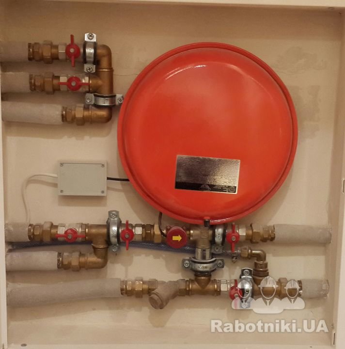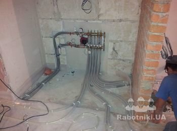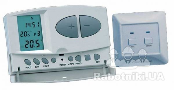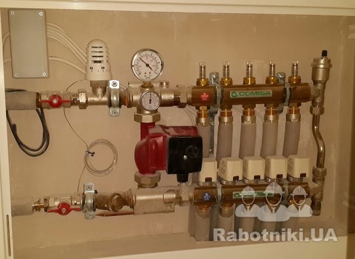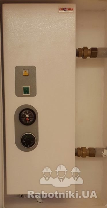 В данном варианте реализации теплого пола, теплоноситель нагревается, как от центрального отопления так и от автономного электрокотла. Автоматика контролирует не только температуру пола, но и температуру в помещении.