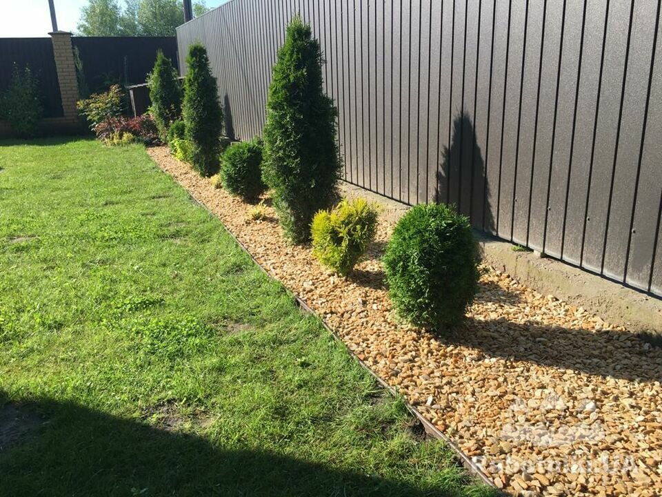 Сочетание декоративного камня с декоративными растениями на участке: туя, можжевельник, барбарис.