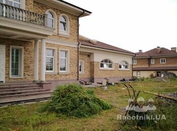 Вирівнювання території, корчування рослинності, підготовчі роботи для вкладання бруківки, встановлення бордюрів.