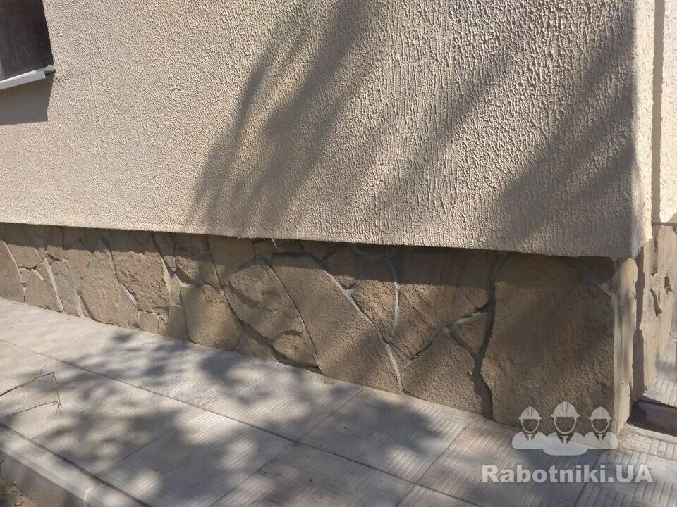 Строительство дачного дома, кладка декоративных элементов цоколя и тротуарная плитка, упрощнный фасад
