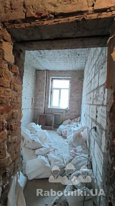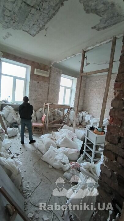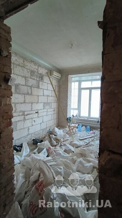 Демонтаж штукатурки, упаковка мусора в мешки и вывоз.