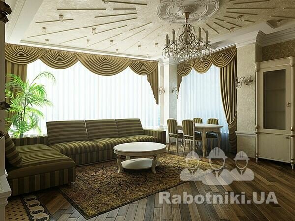 Підлога керамічна плитка та дерев'яний масив. Стіни та стеля - шпаклівка, гіпсова ліпнина, фарбування і обої шелкографія.