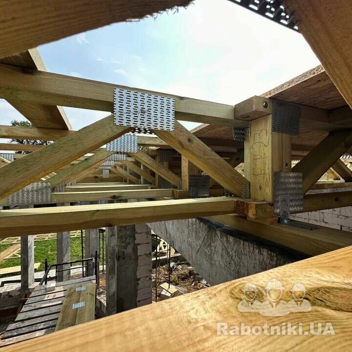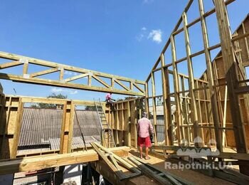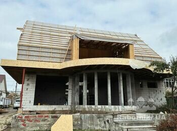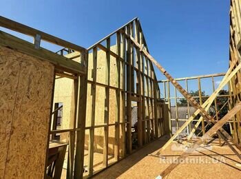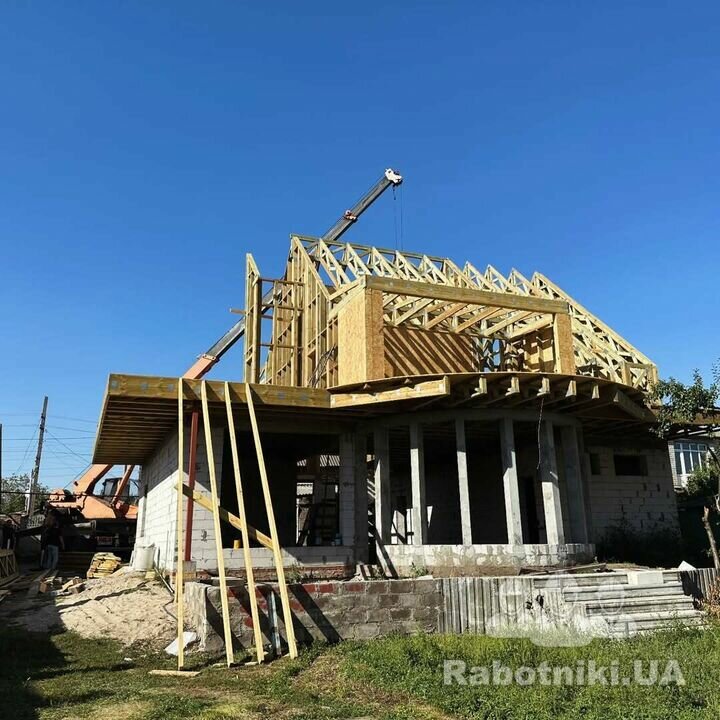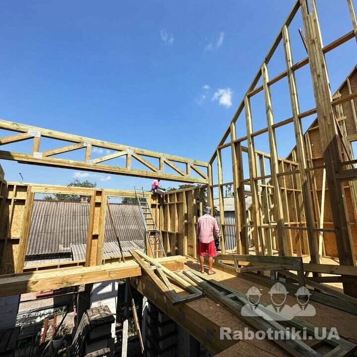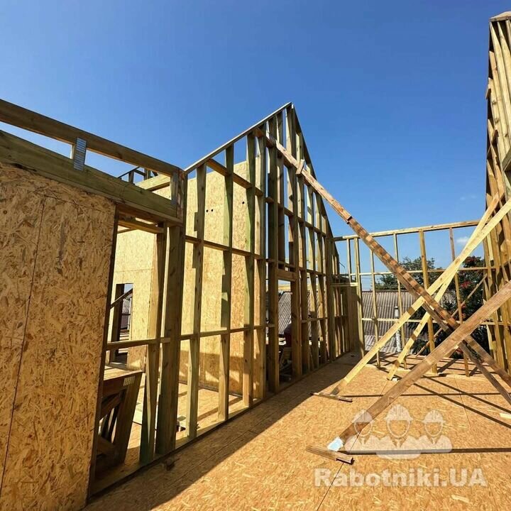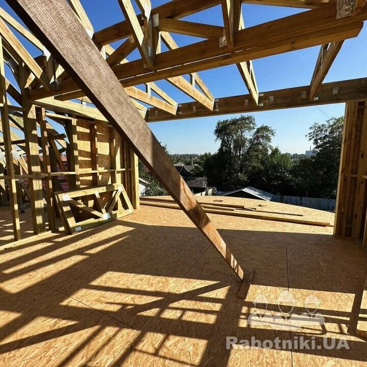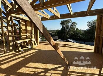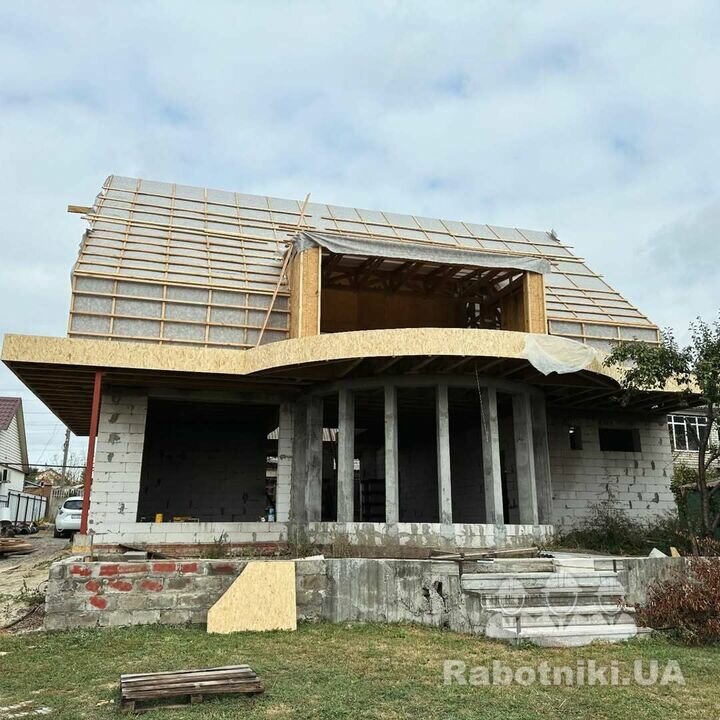 Був запит на виготовлення та монтаж перекриття, стін другого поверху, даху. Ферми мітек/каркасний будинок. В подальшому іншими спеціалістами було накрито фальцем та тимчасово заморожено будівництво.