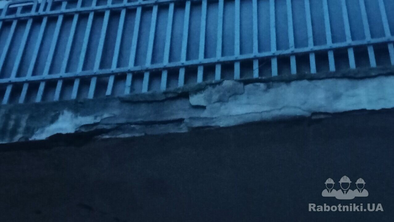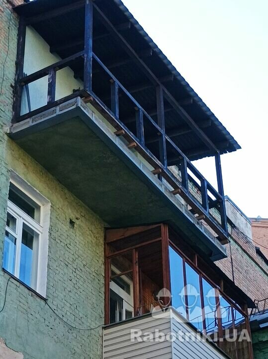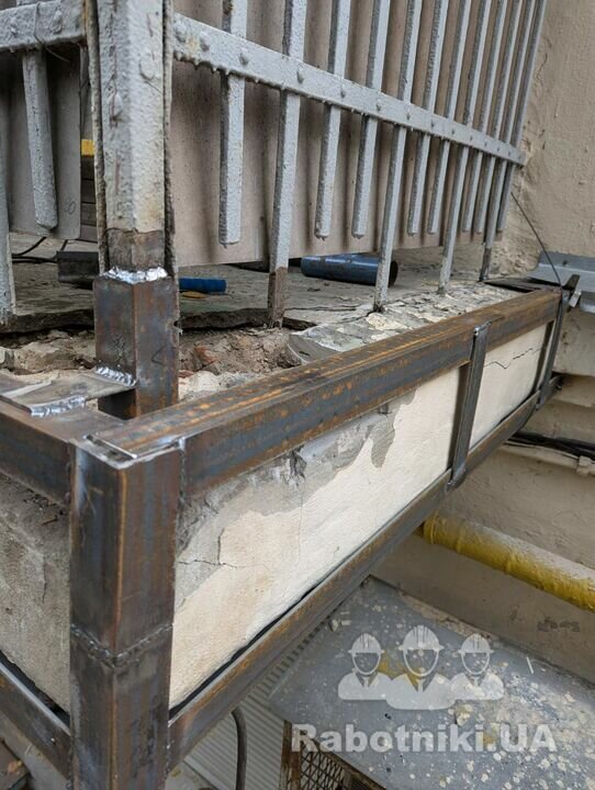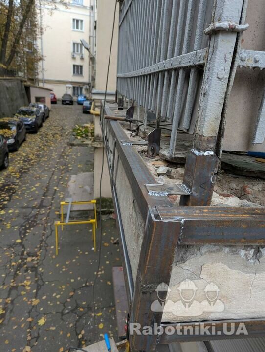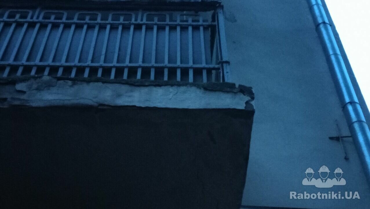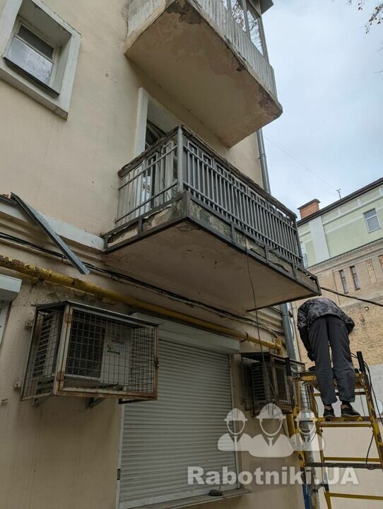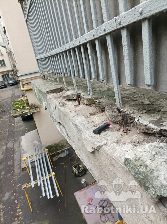 В старому житловому фонді, особливо в центрі Києва балкони в жахливому стані! Більшисть аварійні! Звісно, ім же стільки років! Мабуть робили ці балкони після Другої світової, і в бетон, замість щебню добавляли биту цеглу. Тоді такого матеріалу було вдосталь. Але, з огляду на те, що цегла набирае в себе воду, металевий каркас балконної конструкції геть проїржавів. Зокрема арматура від іржі розбухла, і порвала бетон. Стяжка розсипається, кути обвалюються, огородження висять в повітрі. В першу чергу страждають края балконної плити. Треба терміново ремонтувати. На фото показано як ми це робимо.