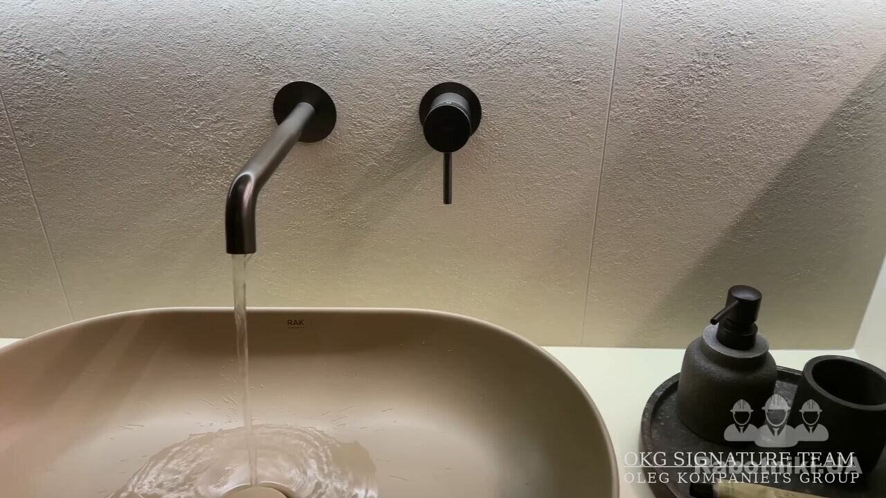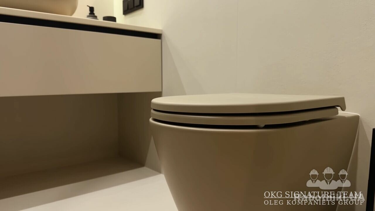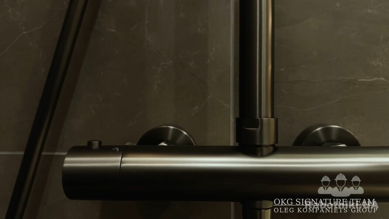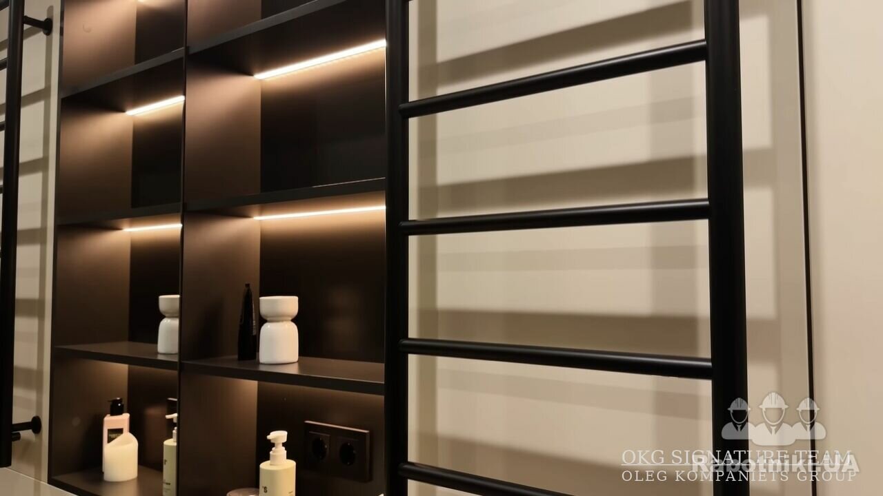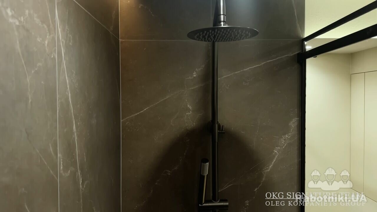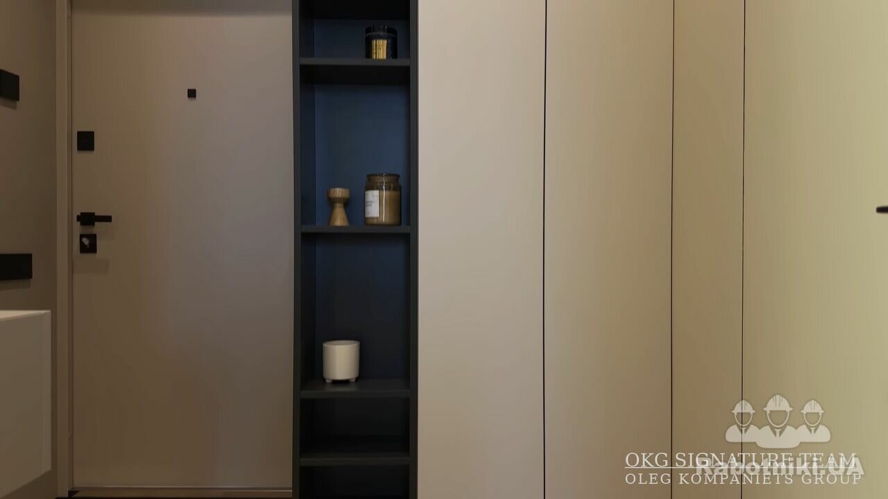 Сучасний мінімалізм у теплій нейтральній палітрі з акцентом на чорну фурнітуру та графітові деталі. Простір продуманий до дрібниць: вбудовані шафи, приховані системи зберігання, інтегроване підсвічування полиць і ніш. Санвузол виконаний у темному камені з матовою сантехнікою, інсталяцією, тропічним душем та продуманими інженерними рішеннями (бойлер, фільтрація води, електрощит з маркуванням груп). Якісні матеріали, чітка геометрія, акуратні стики та технічна грамотність інтерєр, який поєднує естетику та функціональність. Робота виконана під ключ командою OKG SIGNATURE TEAM.