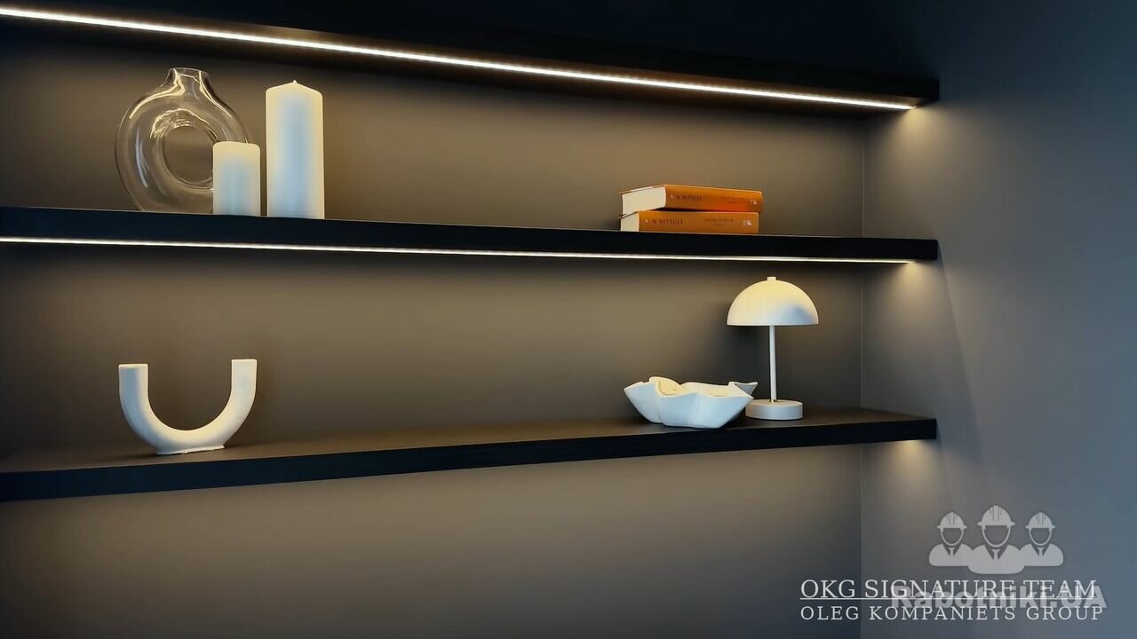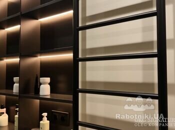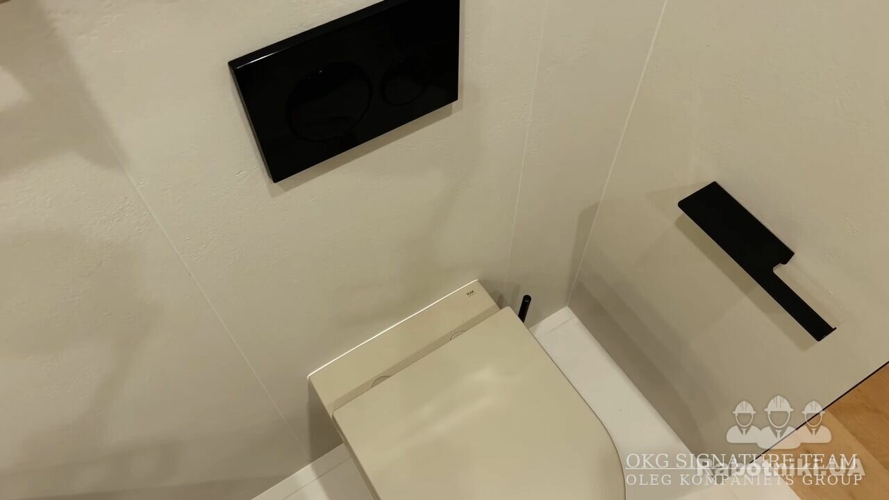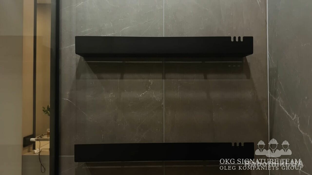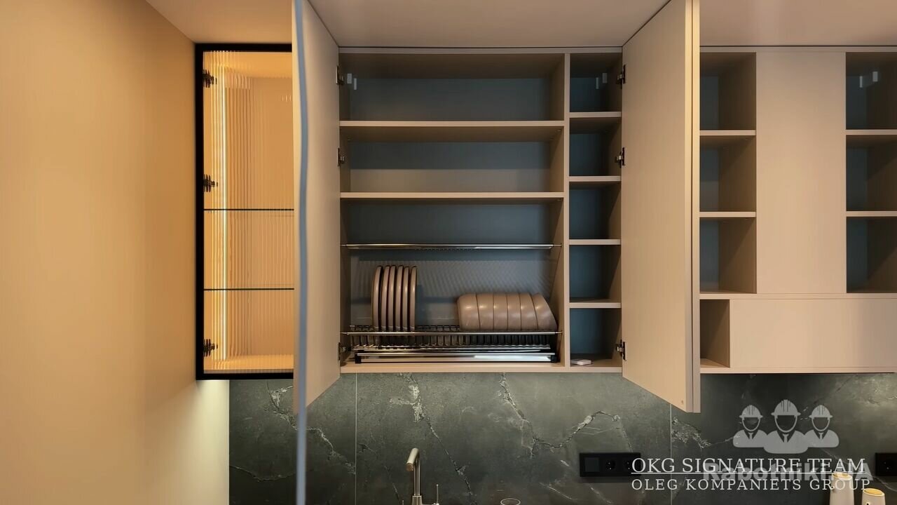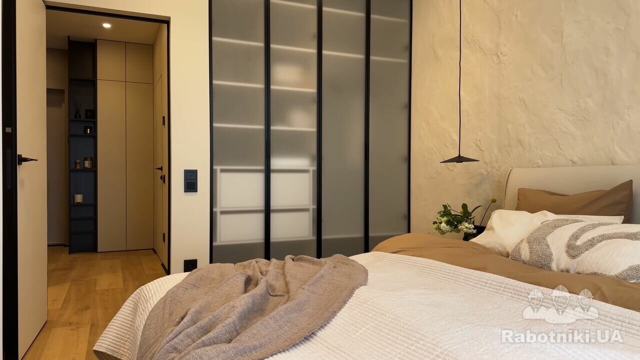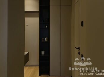 Сучасний мінімалізм у теплій нейтральній палітрі з акцентом на чорну фурнітуру та графітові деталі. Простір продуманий до дрібниць: вбудовані шафи, приховані системи зберігання, інтегроване підсвічування полиць і ніш. Санвузол виконаний у темному камені з матовою сантехнікою, інсталяцією, тропічним душем та продуманими інженерними рішеннями (бойлер, фільтрація води, електрощит з маркуванням груп). Якісні матеріали, чітка геометрія, акуратні стики та технічна грамотність інтерєр, який поєднує естетику та функціональність. Робота виконана під ключ командою OKG SIGNATURE TEAM.