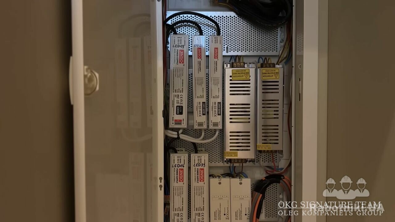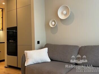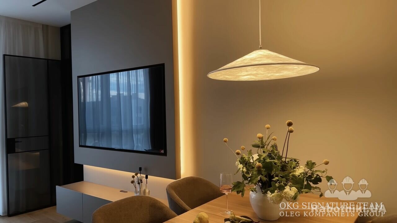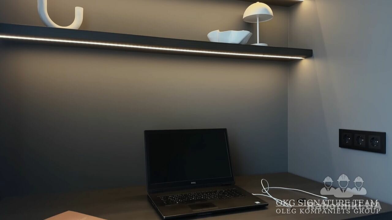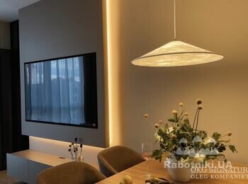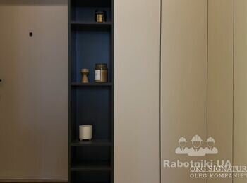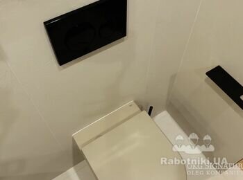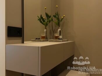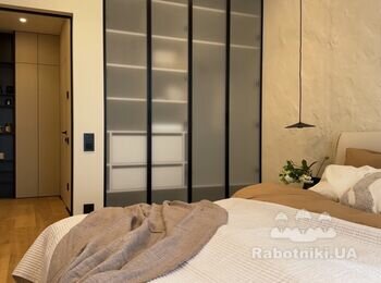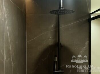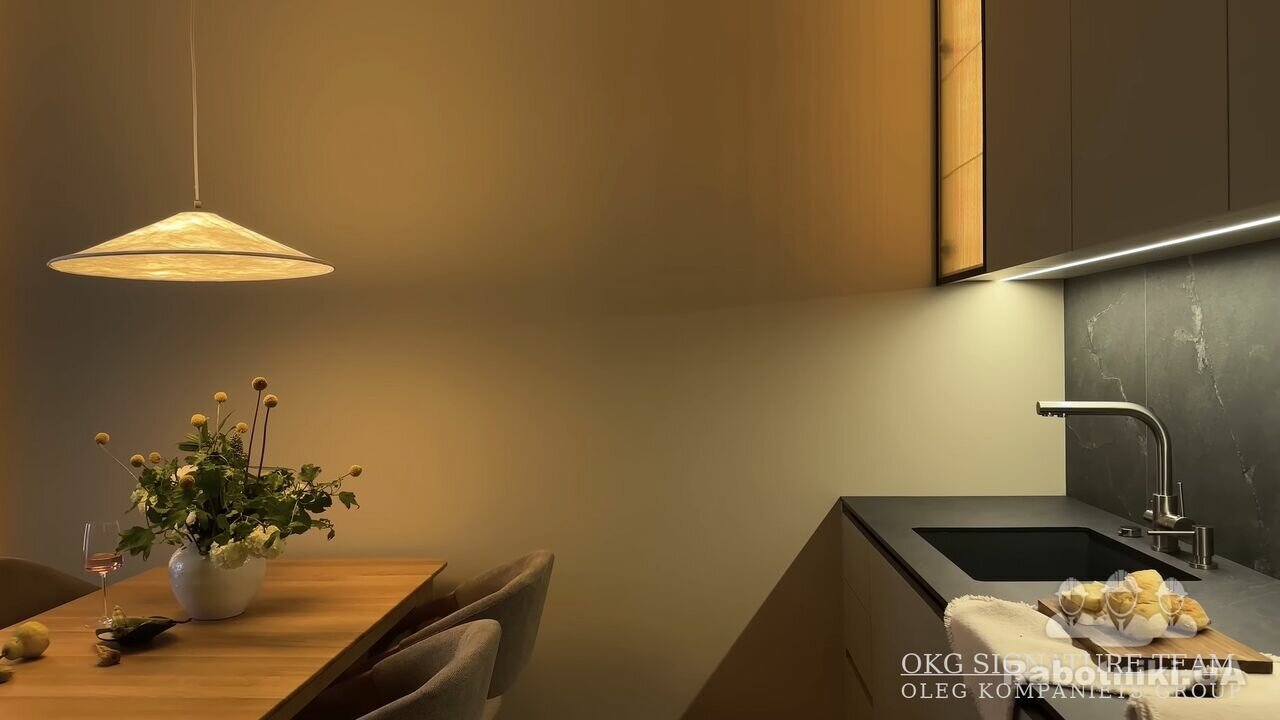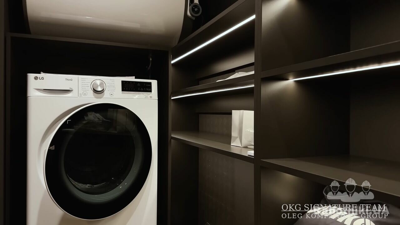 Сучасний мінімалізм у теплій нейтральній палітрі з акцентом на чорну фурнітуру та графітові деталі. Простір продуманий до дрібниць: вбудовані шафи, приховані системи зберігання, інтегроване підсвічування полиць і ніш. Санвузол виконаний у темному камені з матовою сантехнікою, інсталяцією, тропічним душем та продуманими інженерними рішеннями (бойлер, фільтрація води, електрощит з маркуванням груп). Якісні матеріали, чітка геометрія, акуратні стики та технічна грамотність інтерєр, який поєднує естетику та функціональність. Робота виконана під ключ командою OKG SIGNATURE TEAM.