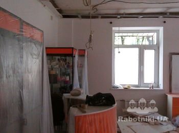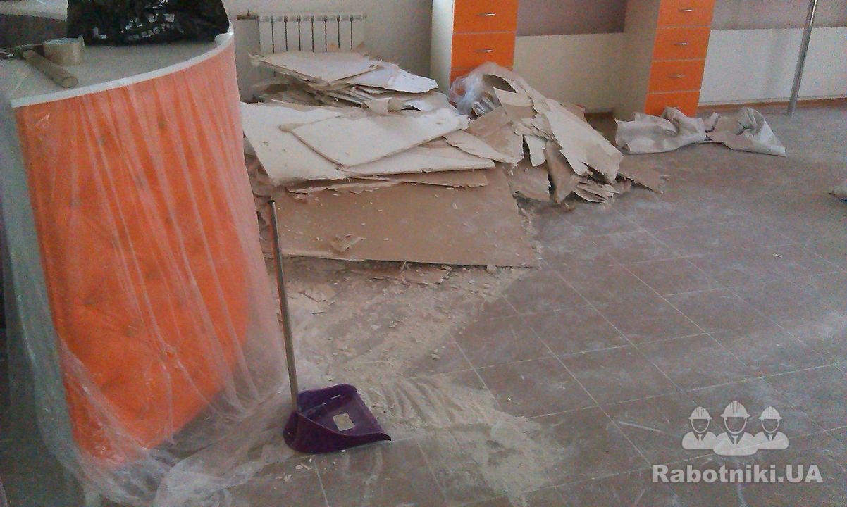 Демонтаж гипсокартона. Около 40 м2 провисшего потолка из гипсокартона. Сложность работы заключалось в том, что потолок был подпертый посередине досками и определенно должен был рухнуть.
