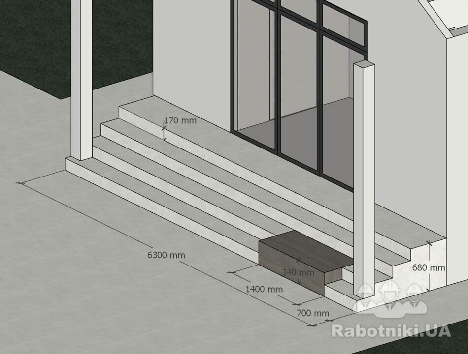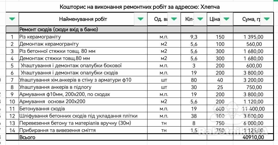 В селі Хлепча, це під Києвом в сторону Василькова, треба виконати роботи по влаштуванню монолітних сходів. Кошторис та креслення (ескіз) у вкладенні. Заливати треба тільки ту частину, що виділена кольором. + до кошториса додаю 4000 грн на транспортні витрати.