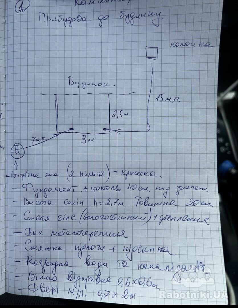 Матеріали на обʼєкті. Житло надається. Потрібно побудувати гараж з газоблоку 3,6з6,2 м. Дах односкатний металочерепиця, висота стін з одного боку-2,7 м, інша-2,4 м. Фундамент 30х40