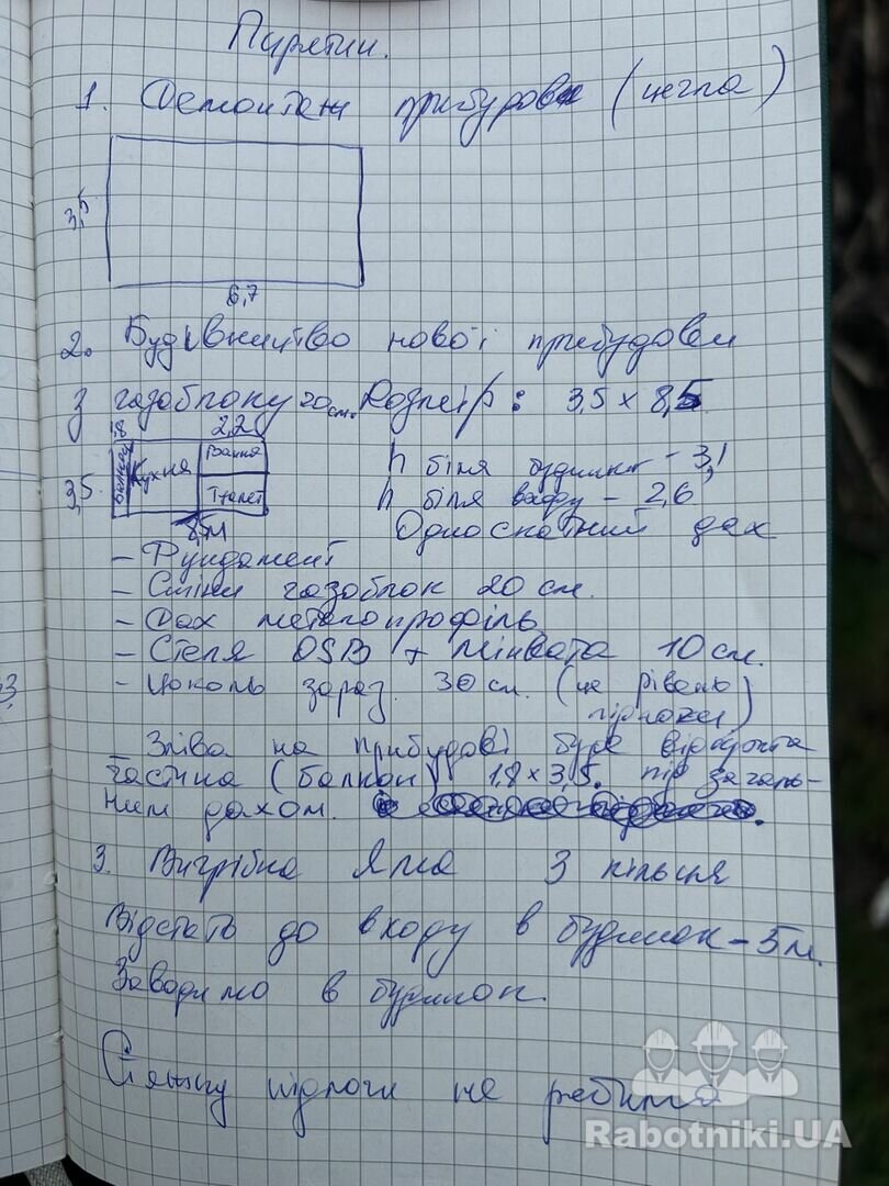 Портібно демонтувати стару і побудувати нову прибудову 6,7 х 3,5 м і до неї зробити навіс 1,8 х 3,5 м.