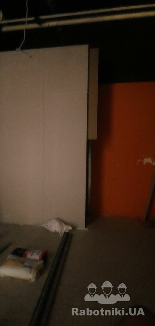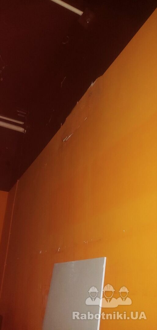 торгове приміщення площею 28м.кв - часткове! фінішне шпаклюювання, шпаклювання стін з г/к новозробленої кладовки з обох боків (20м.кв разом) + верхньої частини стін (вище відмітки 2700) орієнтовно 5000х1200 - 2 стіни; і стінового виступа - напівколони 1100х300х4000 чотири вертикальних участка стіни орієнтовно 600х4000 - 2шт і 900х4000-2шт (все разом близько 50м.кв)