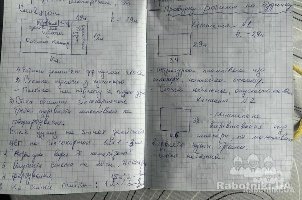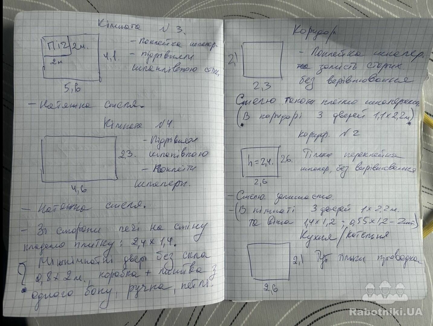 Демонтаж по стінах (окрім ванної кімнати) роблять замовники. Стеля натяжна не входить в вартість робіт. Стіни- частково штукатурка, шпаклівка, шпалери. Санвузол- стяжка, плитка, стеля- гіпсокартон, розводка води і каналізації, стіни- частково плитка. Детальний опис робіт на фото