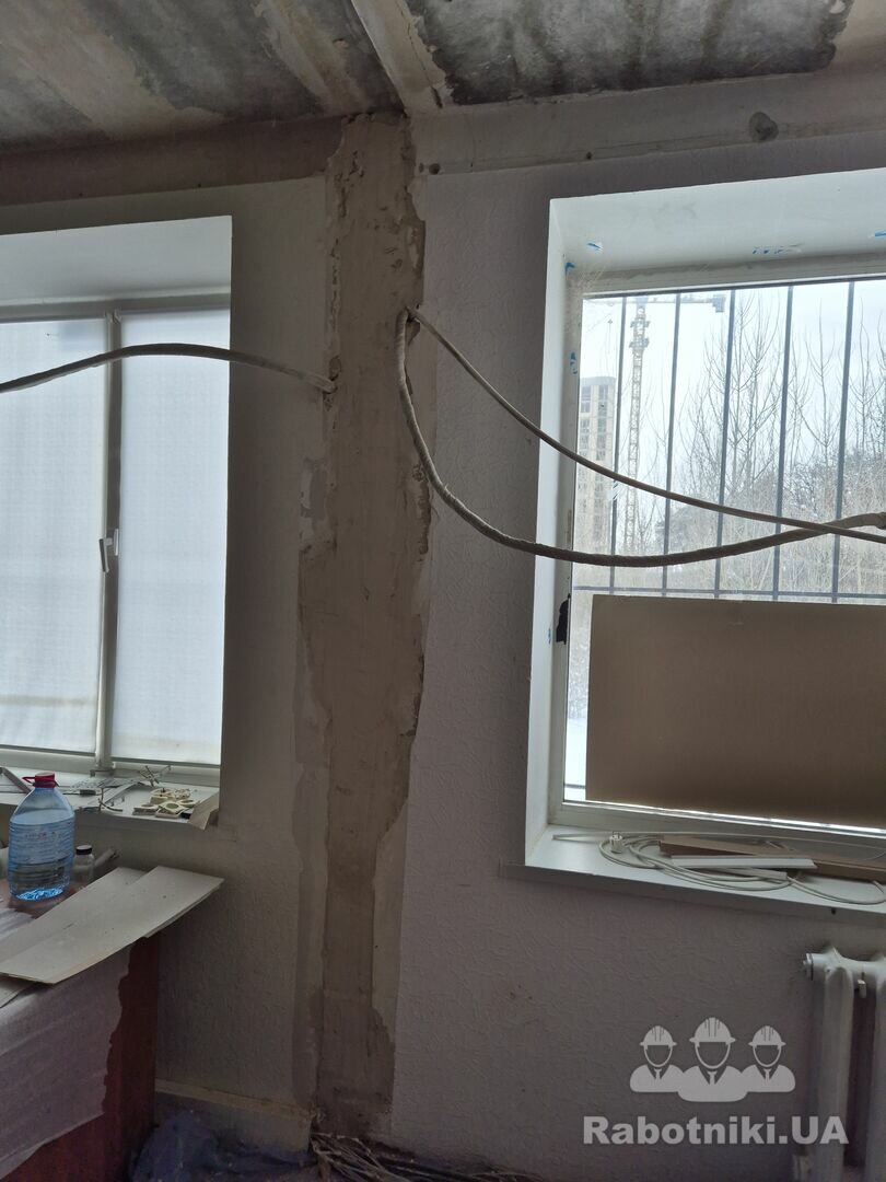 По стенам небольшой объем (после удаления простенка, на фото видно) по выравниванию кривой штукатурки, шпаклевка. Шлифовка/выравнивание стяжки там где был простенок (накидали стяжки но не доделали, те кто убирал стену).