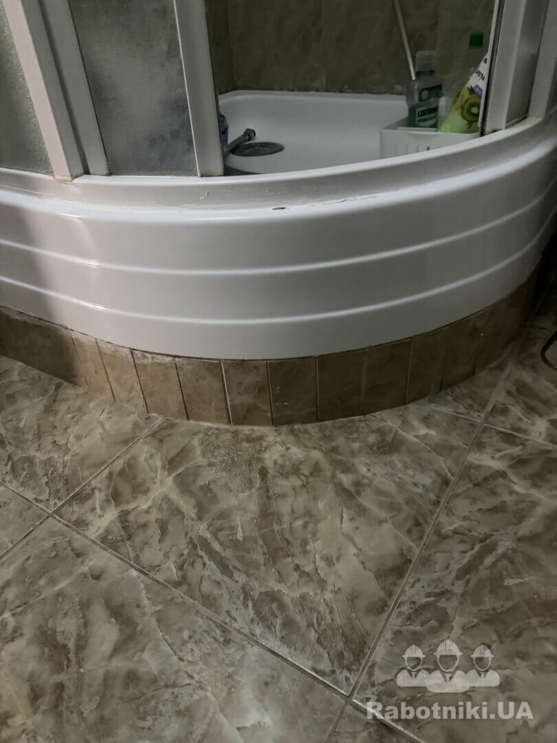 Потрібно зробіті демонтаж душевоі кабіни та пандусу на якому вона стоіть. Винести та вивезти залишки. На тому місці де була душова кабіна покласти плитку (2 кв м) та переробити злів душовоі під злив для пральноі машинки.