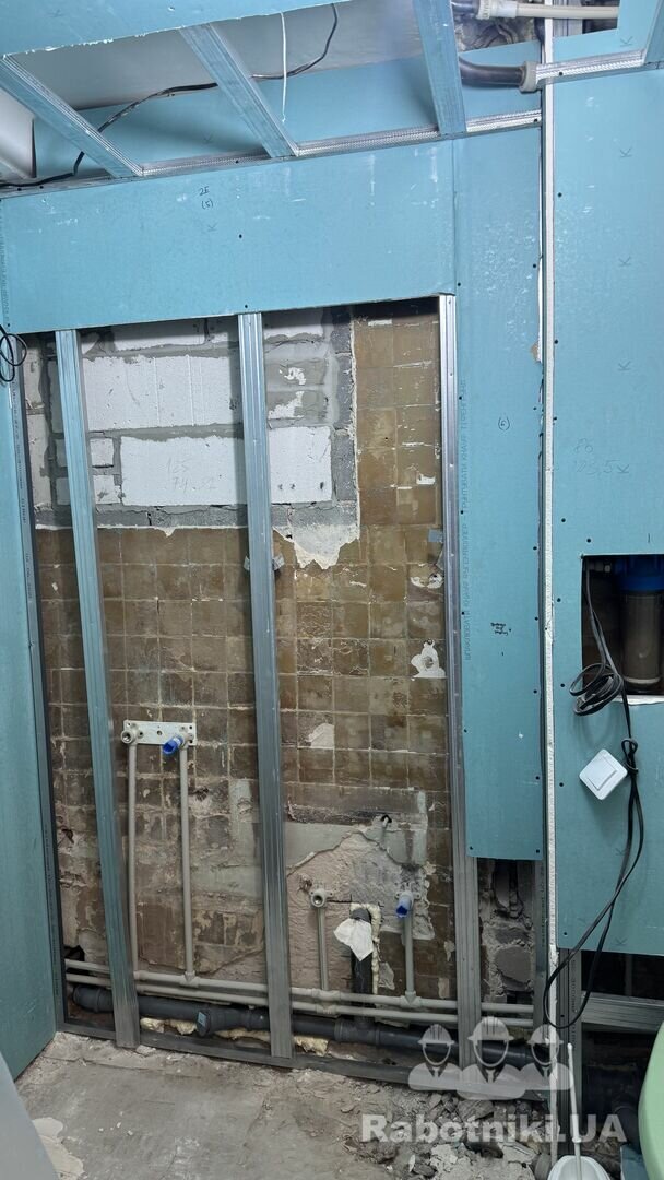 Важлива умова робота має виконуватися з пилососом, щоб мінімізувати пил (у квартирі є речі). Є тимчасові двері з плівки, всередині ванної є подовжувач. Виконавці повинні мати свій будівельний пилосос.