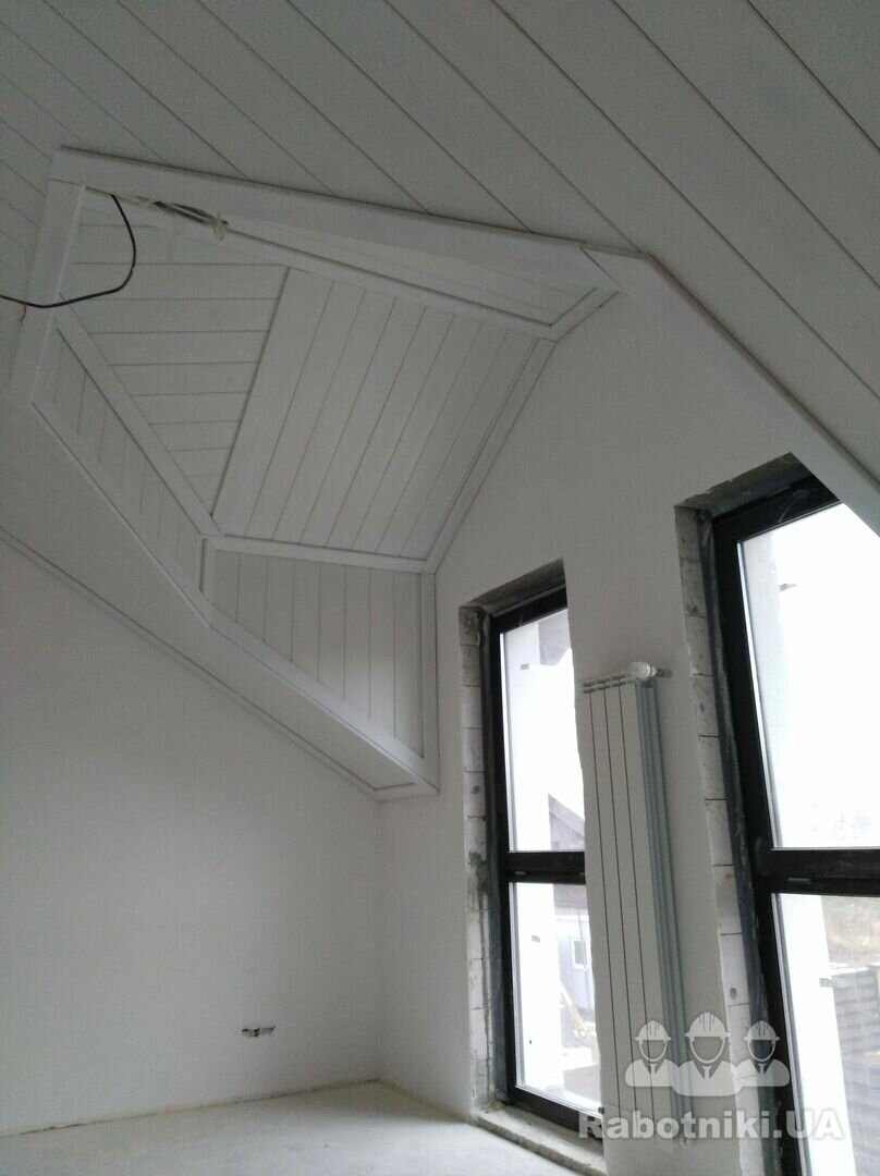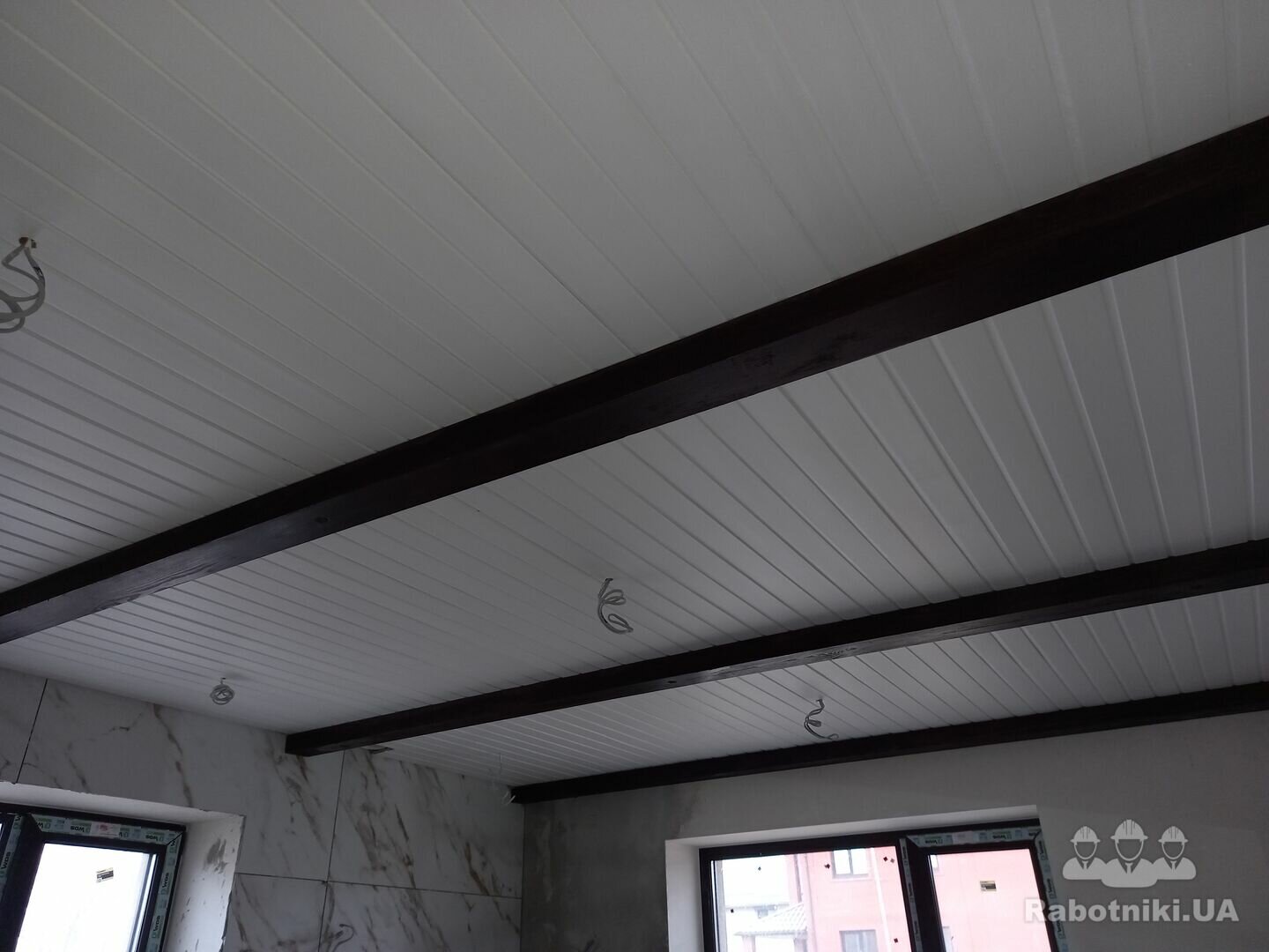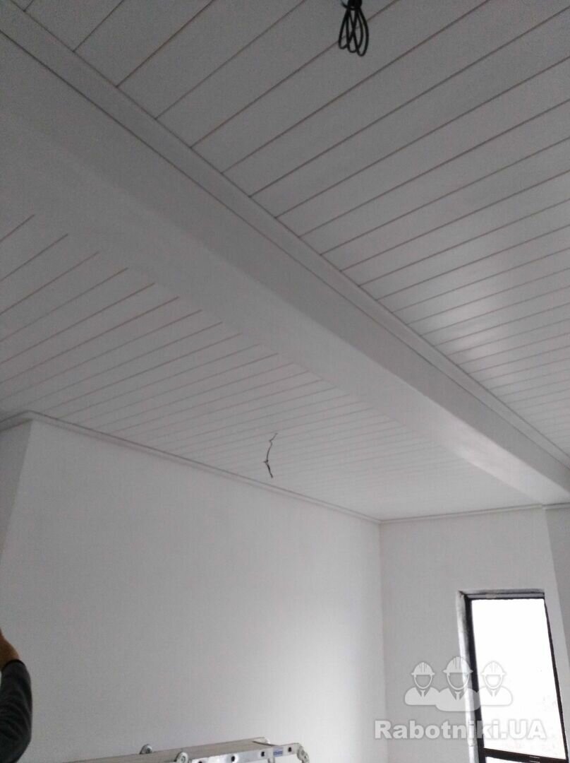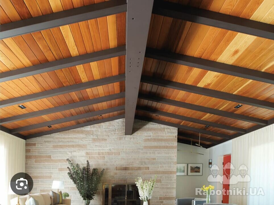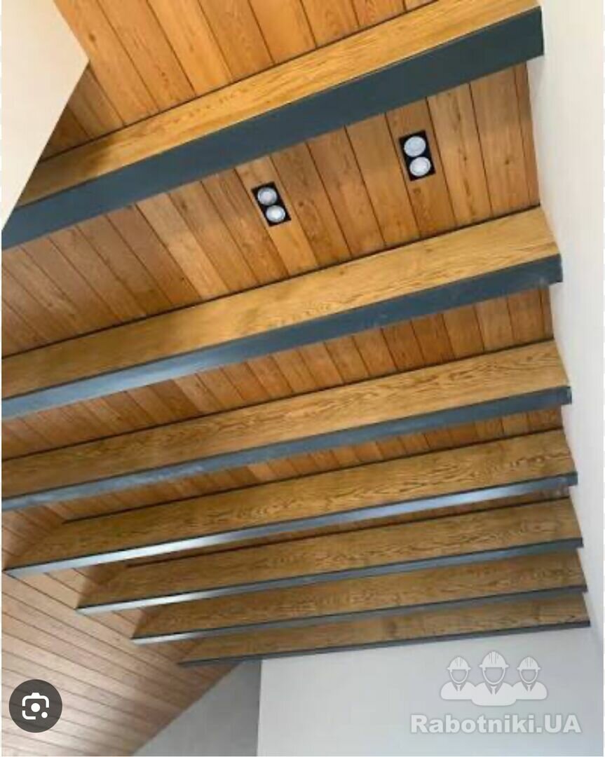 Щоб було так, як на фото, треба було балки відшліфувати, фрезером зняти кромку, убрати всі дефекти, а уж потім встановлювати. Зараз все це треба робити на висоті і до чистових робіт. Пилу буде дуже багато . Балки треба заколірувати до встановлення дошок. І дошки теж треба шліфувати на низу і колірувати теж на низу. А уж потім тільки встановлювати. Я розумію, що вам треба за це платити , а ой как не бажається. Якщо так не робити , то фото ваші можете кинути у грубу. Роботу можно оцінити в 2500грн за кв.м. І тоді буде вам як на фото. А мабуть і кращє.