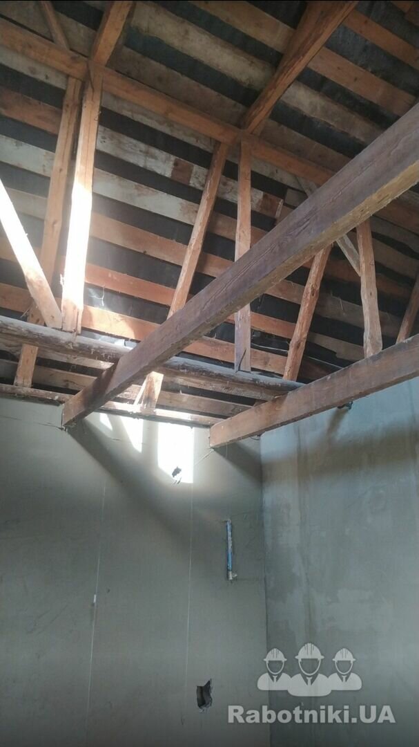 Треба зачистити та підготувати до монтажу існуючі балки.А потім покласти поверх балок дошку.