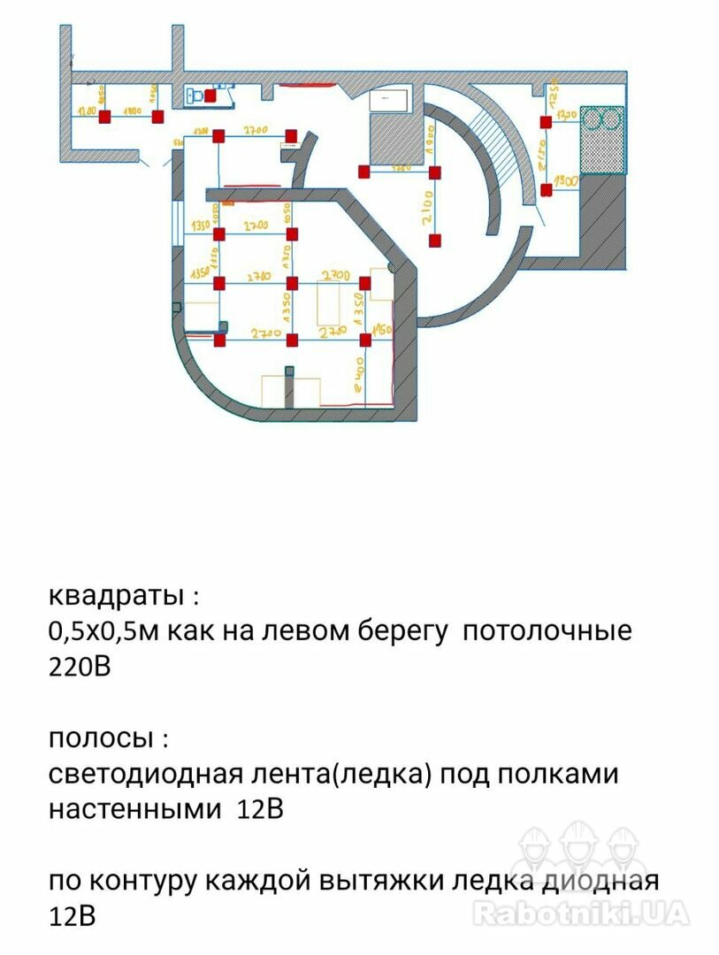 Де помічено червоним потрібна проводка в штробі по полу. Висота розеток 1м.