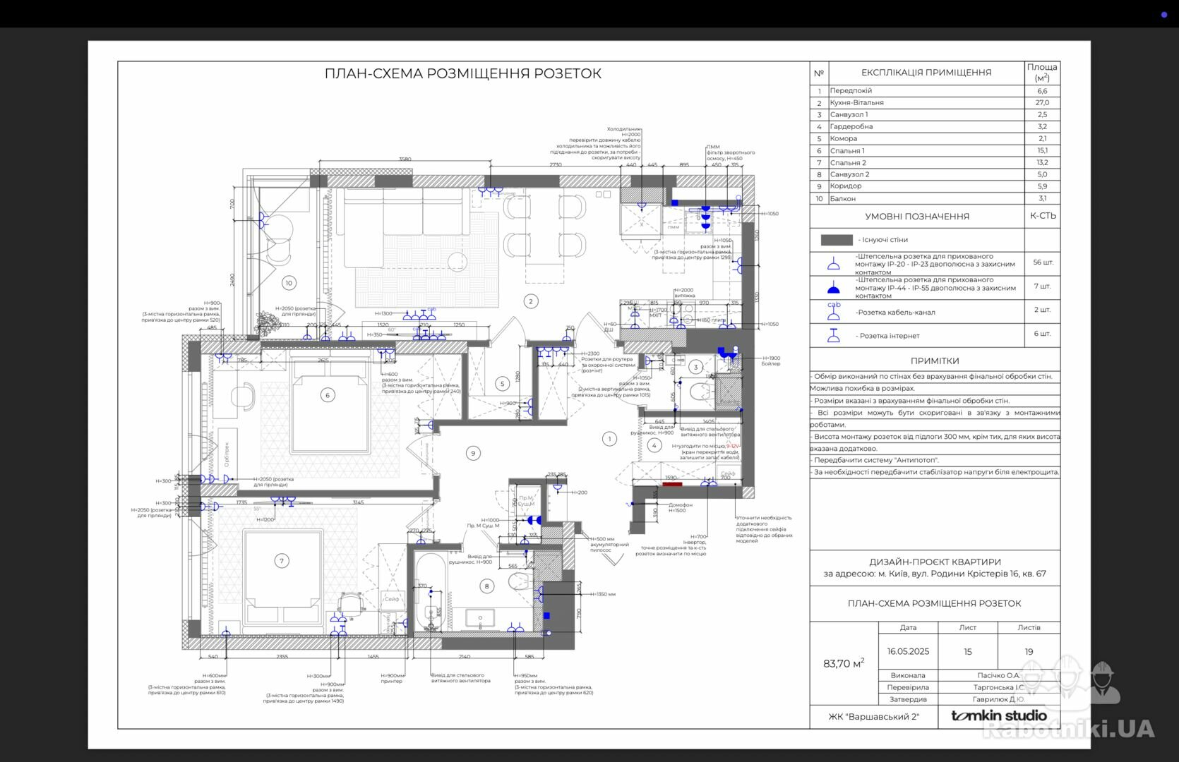 Електромонтажні роботи в новобудові 83м2 Розведення проводки по стелі з комутаціями в розподільчих коробках з гільзуванням скруток Чекаю на кошторис робіт та розрахунок кількості матеріалів Проект в файлах