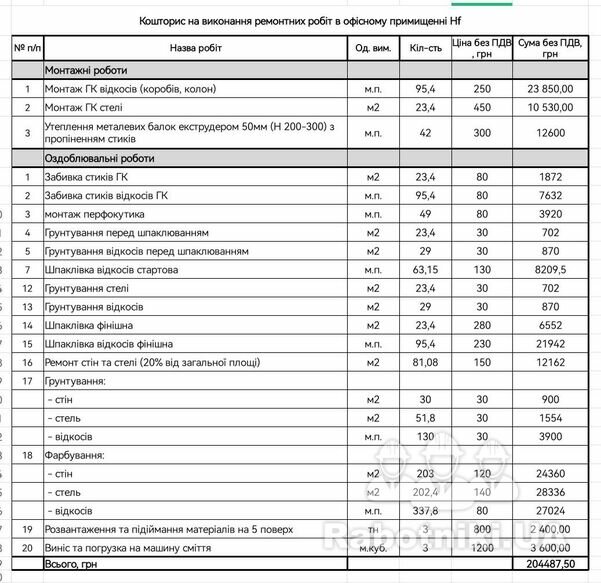 В офісному приміщенні потрібно виконати гіпсокартонні і малярні роботи. Був проведений демонтаж частини стелі і відкосів/коробів вздовж віконних конструкцій. Зараз підрядник виконує каучукову (пінну) ізоляці. (було промерзання.. Потім треба все зашити гіпсокартоном , пошпакювати та пофарбувати. Також поварбувати всі інші стіни на стелі в приміщенні. Кошторис у вкладенні. Приступати можна вже.