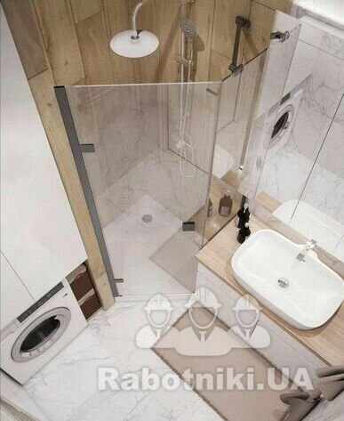 Встановлення душової кабінки (з герметизацією примикань), інсталяції, дзеркала та умивальника з тумбою, під єднання пральної машини.