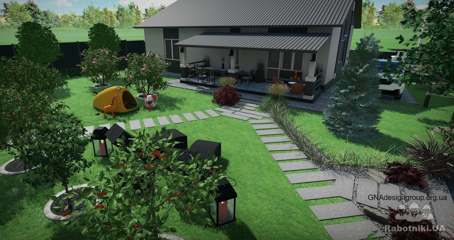 + розробку зонування/планування та проектування благоустрою території та Ландшафтного дизайна, вхідної/в їздної групи, тераси, навісу, різноманітних зон відпочинку, підбір рослин та тротуарної плитки, доріжок, моделювання індивідуальних локацій і т.д., 3д візуалізацію цього, 2д плани, освітлення (нічна версія) і т.д. 3д відео-ролик, 360 градусів панорами.