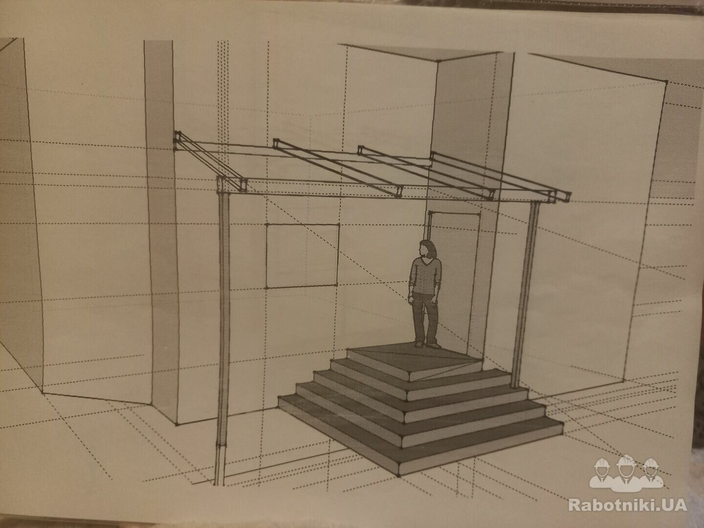 Потрібно 1 металевий стовп приварити, другий забетонувати. Зробити дерев яний каркас та накрити металочерепицею. Монтаж зливної системи. креслення додаю.