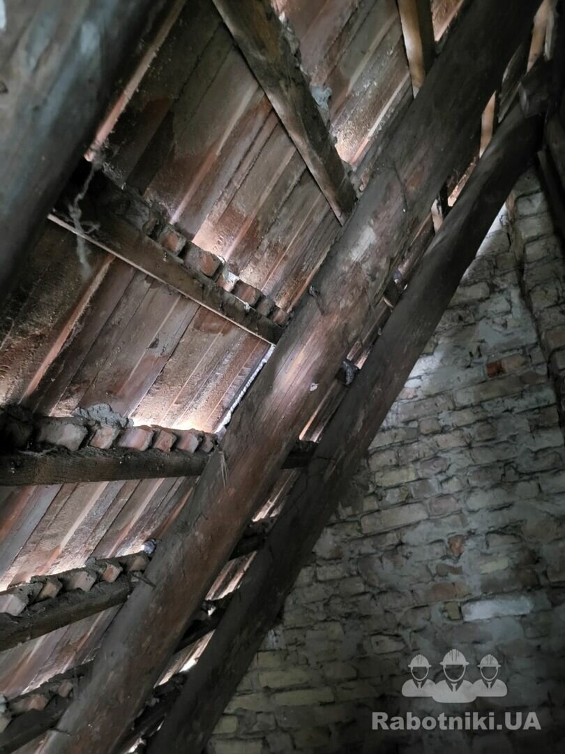 Двоскатна покрівля. Потрібно демонтувати покрівельний матеріал до крокв, потім монтаж нової покрівлі (керамічна черепиця) включаючи утеплення мінватою 250мм з усіма мембранами. орієнтовно 85 м2.