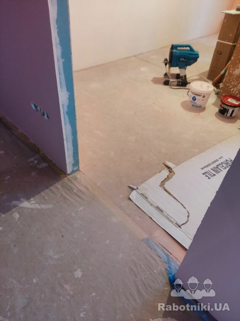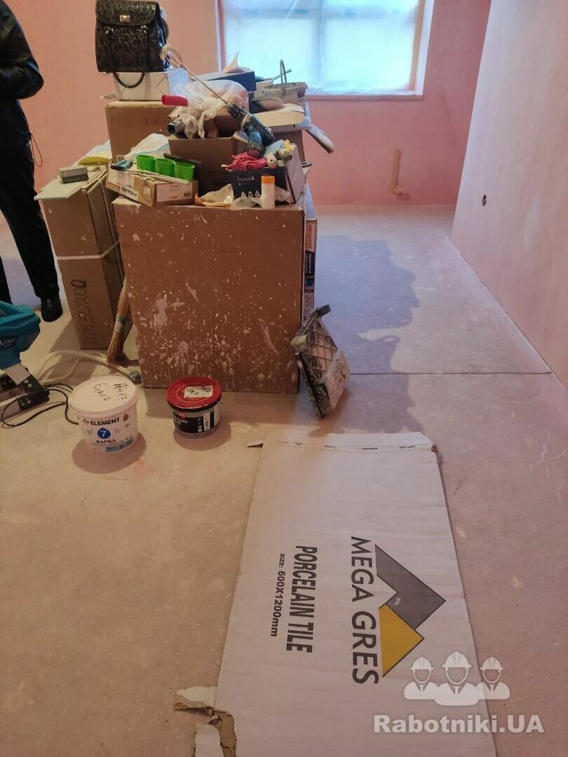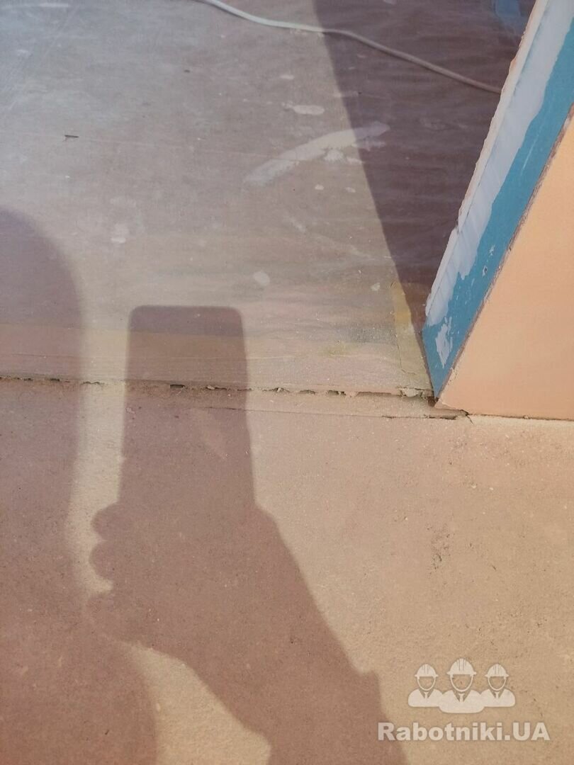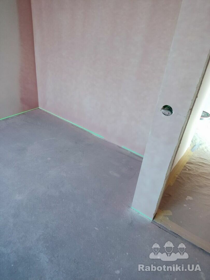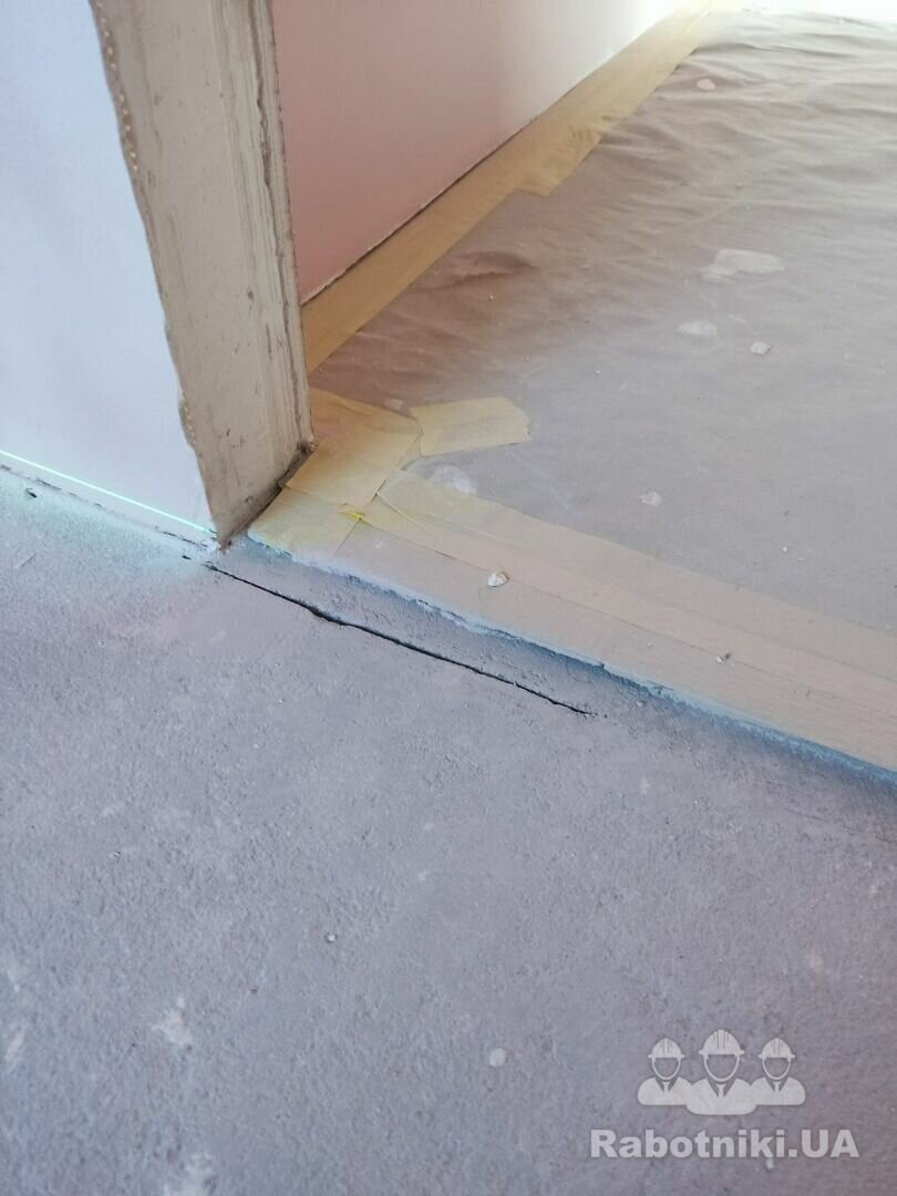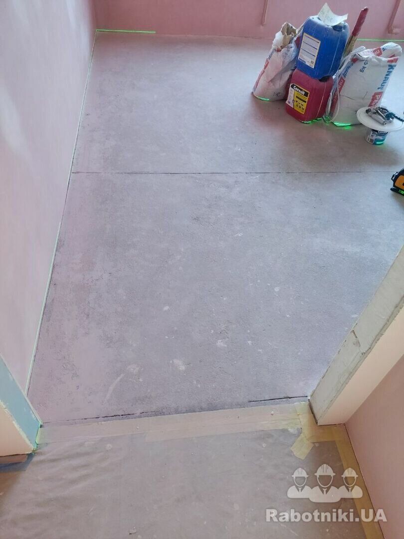 Стяжка від забудовника, присутні перепади. Необхідно підшліфуватись під рівень плитки біля порогу 2-3 мм та познімати деякі нерівності на стяжці. Обезпилити, погрунтувати, постелити підкладку, змонтувати ламінат ялинка 90⁰. Шви з плиткою загерметити. 25 м Пишіть пропозиції в месенджери. Дякую.