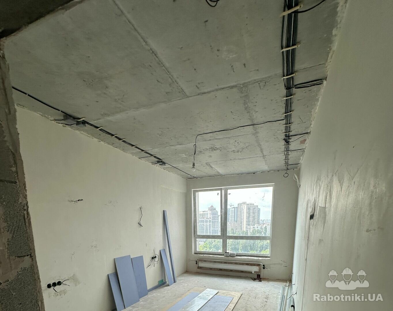 Квартира 50м, 5 кімнат. Частково парящий профіль з лед підсвіткою. В кухні та спальні карнизи з лед підсвіткою. Всього 3 люстри, 20 світильників. Стеля однорівнева, полотно матове.