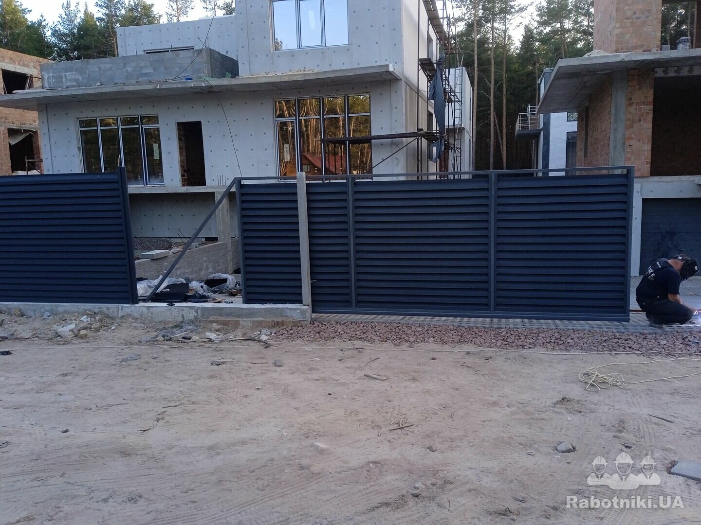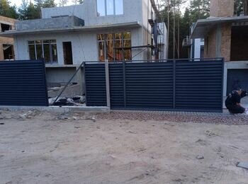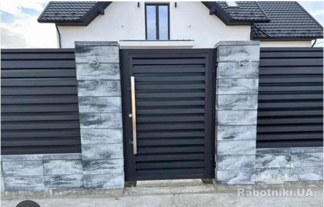 Потрібно зробити паркан комбінований 18,3 м низ - фундамент глибина в землю 25-30 см, на землею 5 см, ширина 20 см. Над фундаментом 2 блоки і жалюзі, колони з блоків між секціями ( як на фото) висота паркану -1,8 м, колони- 2 м. Ворота відкатні механічні- 4 м, калітка- 1 м
