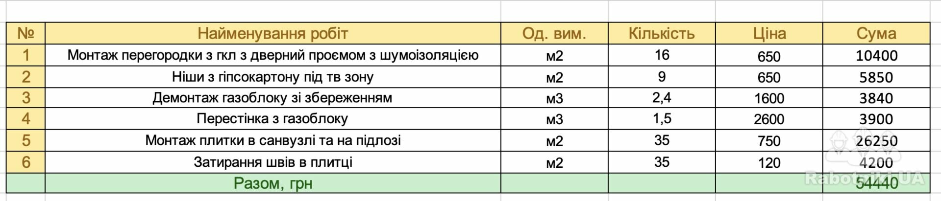 Монтаж перегородок з ГКЛ, Газобоку та вкладання плитки в квартирі Нижній Вал, Обєми і додаткові роботи перераховуються по факту виконаних робіт