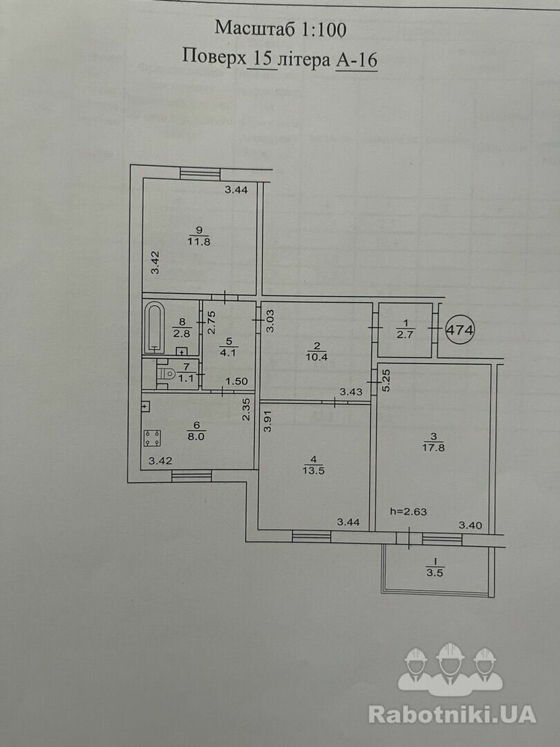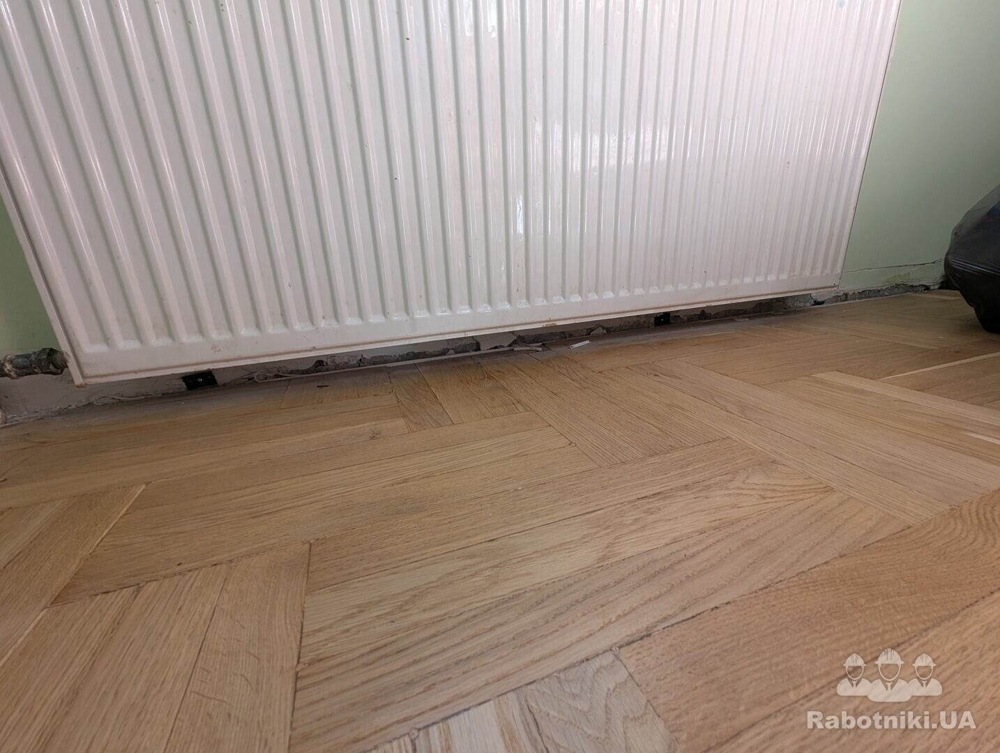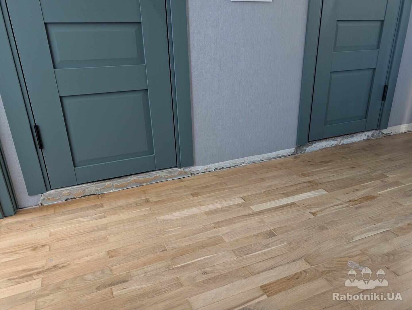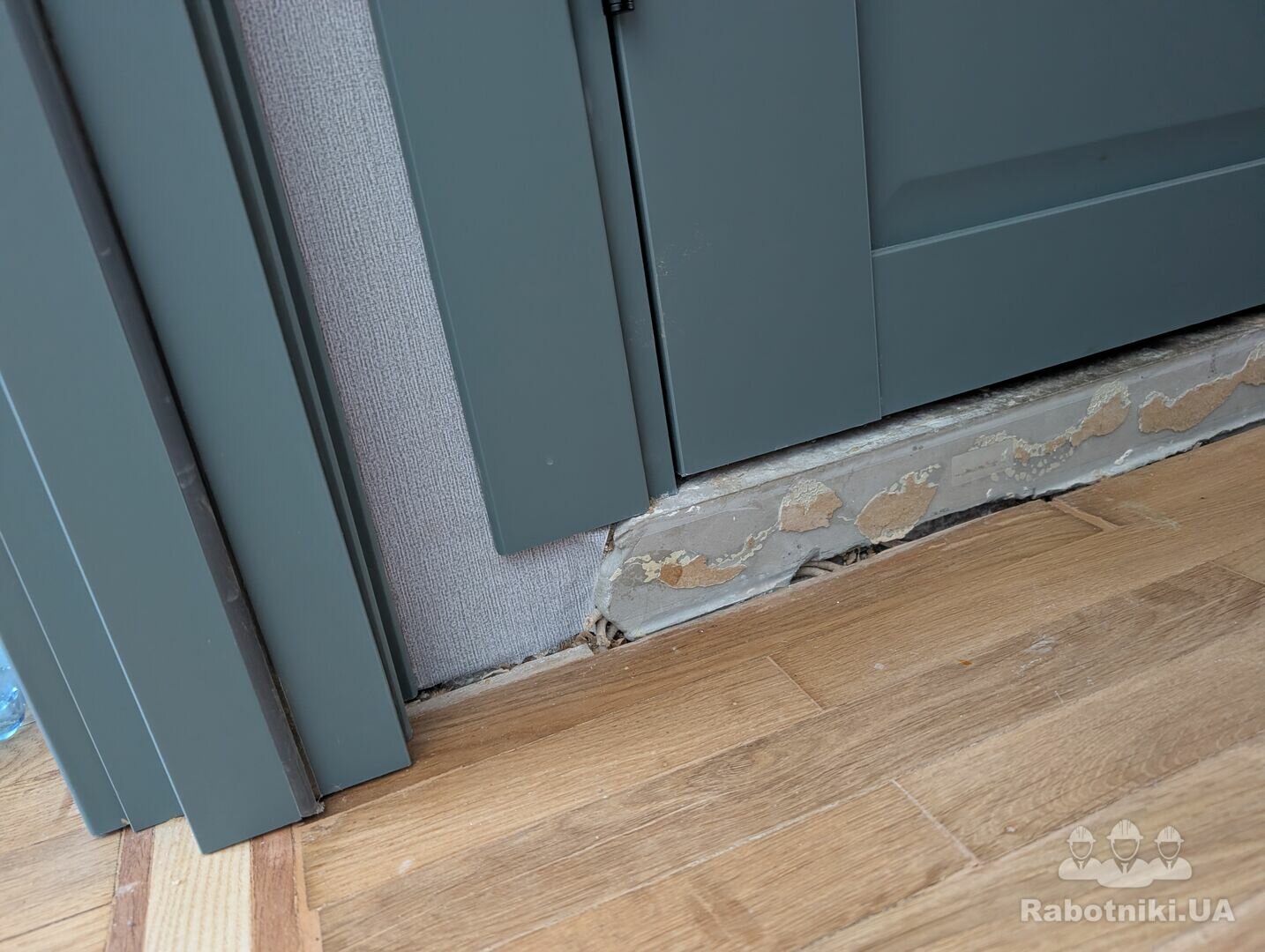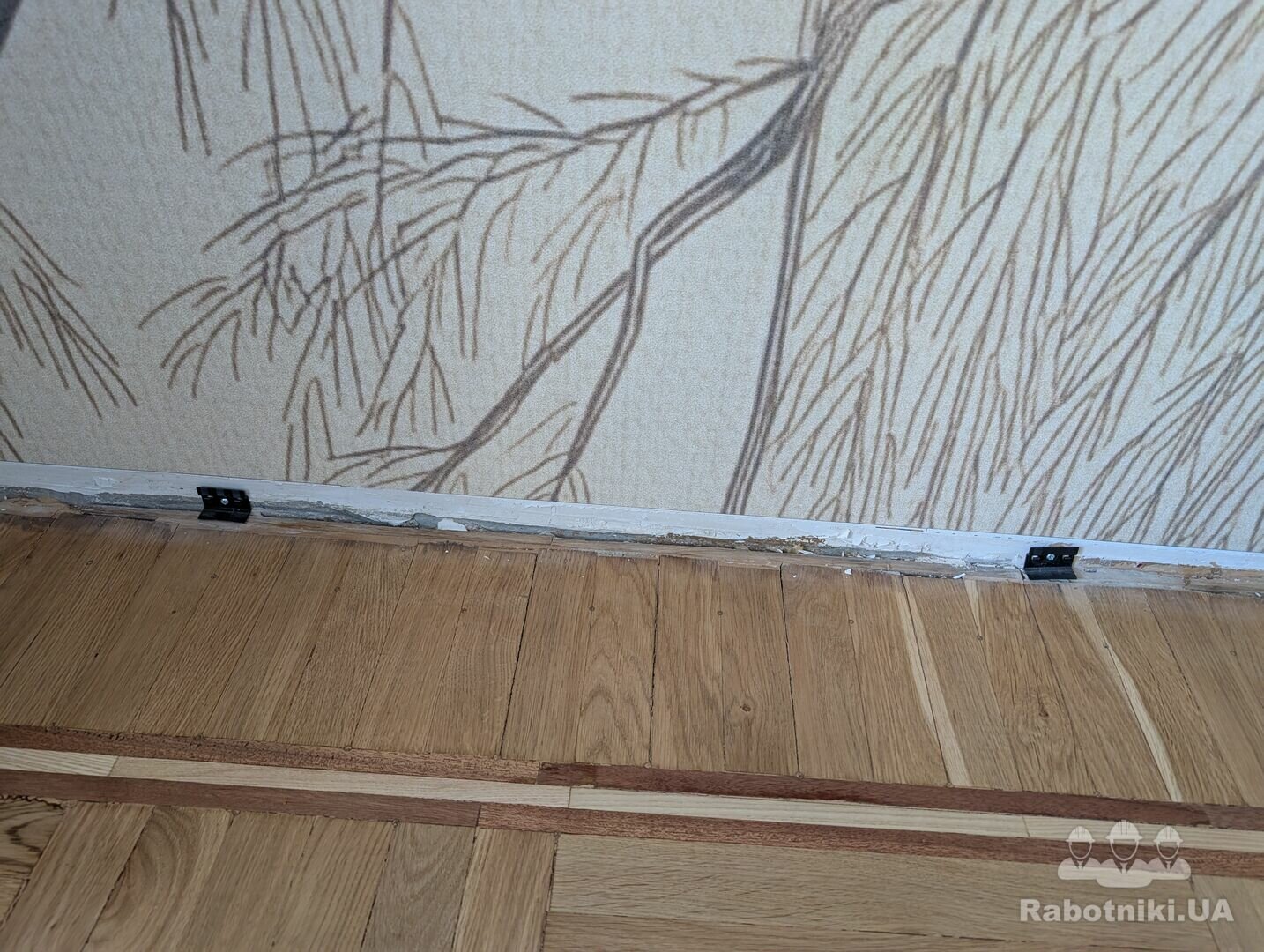 Потрібно монтувати плінтус МДФ в двох кімнатах (в одній кімнаті вже встановлені кріплення, це кімнати 3 та 4 на плані). Біля туалета та ванної та під однією батареєю треба зрізати частину плінтуса перед встановленням (зменшити висоту). Біля туалета зрізати частину бетонну для встановлення, на фото.