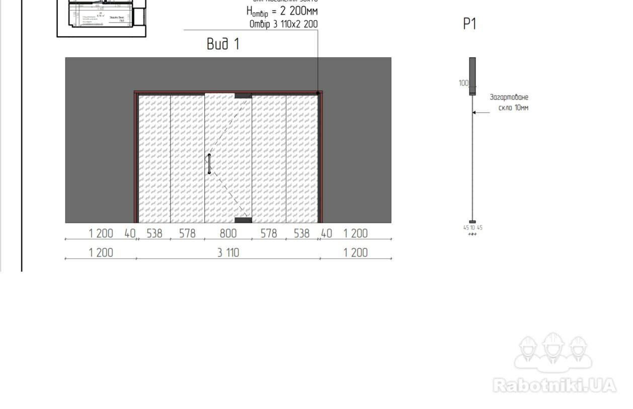 потрібно змонтувати скляну перегородку розміром 3110*2200, яка складається з 4х секцій та одних дверей (фото у вкладенні). Та троє скляних дверей 800*2200