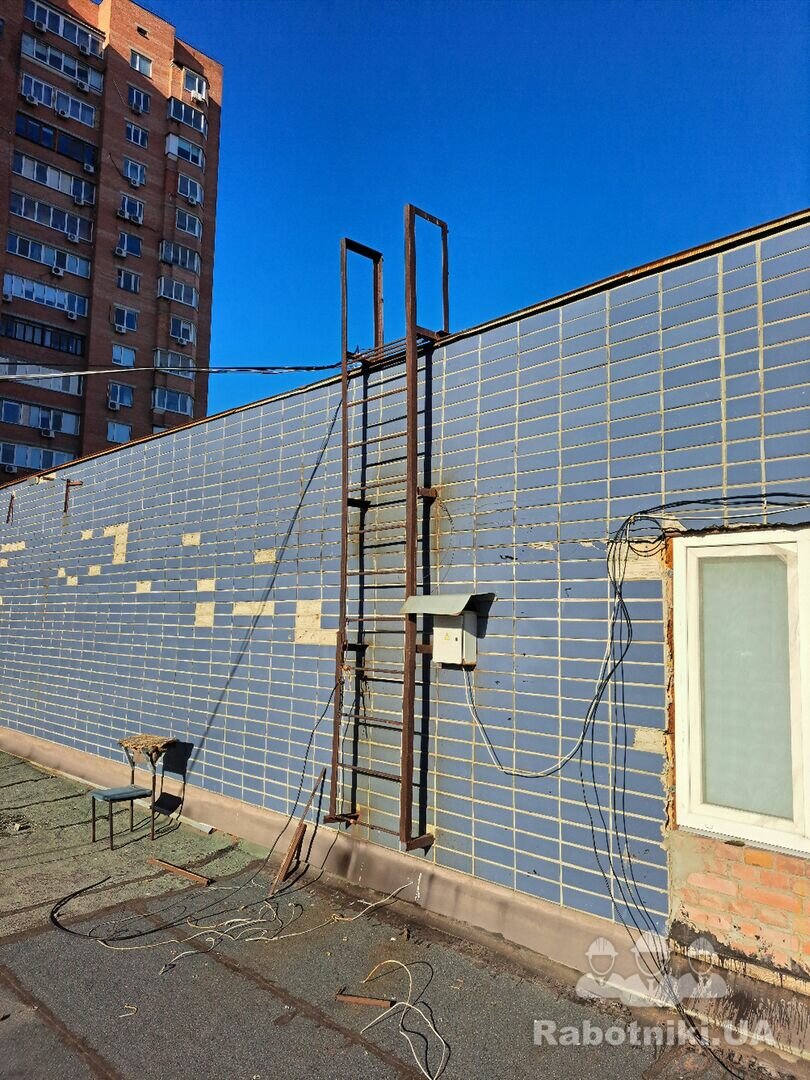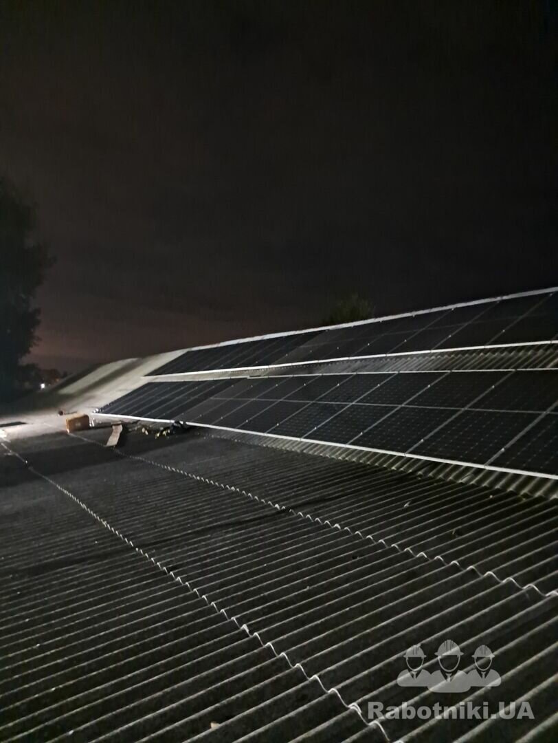 Місце монтажу знаходиться на даху 2-пов. будівлі зі зручним доступом. Занос панелей по сходинах. Перед монтажом попередньо треба зрізати металеву дробину зі стіни. Прокласти кабель по стіні і підключити до інвертора, який зараз працює в режимі ДБЖ.