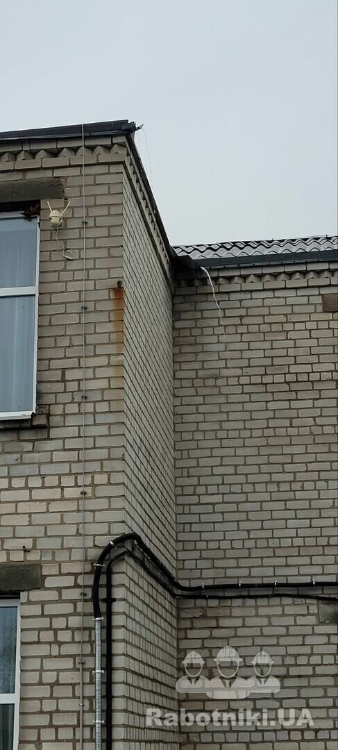 Треба змонтувати: водостічних воронок кутових оцинкованих-11шт, водостічних труб пластік-80 м.п. з вишки тури. Висота 7м.