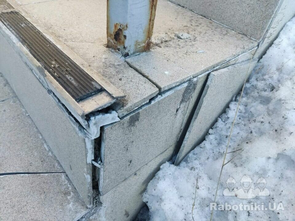 Потрібно зробити демонтаж старої плитки, виконати підготовку під плитку і облицювання плиткою майданчику сходів, та фасаду вхідної групи. Об єм робіт загальна площа близько 12-13м.кв ( разом з погонажем сходів) все в круг
