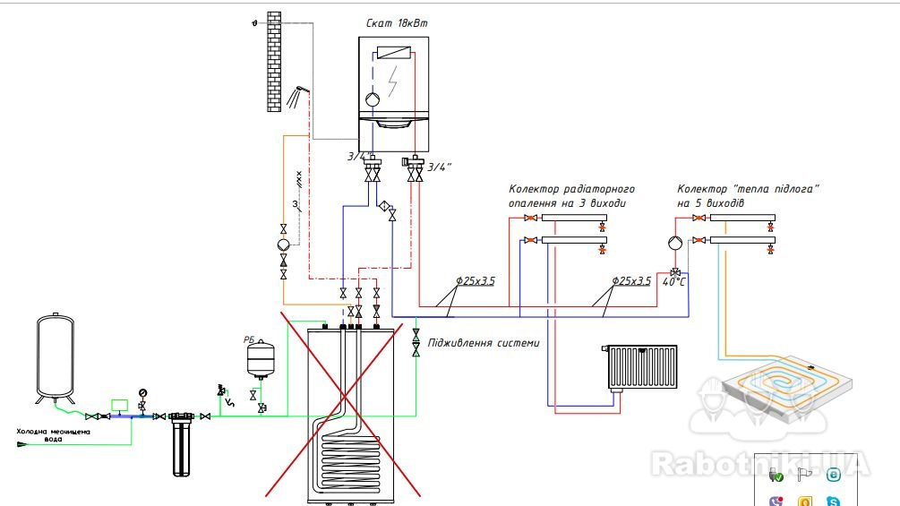 Нужно устроить простую котельню. Обвязать желательно медью. Главные задачи: - Устроить ввод воды в дом (с фильтром) - Подключить и обвязать электрический котел - Смесительный узел для теплого пола - Подключить и обвязать электрический бойлер с рециркуляцией - Опрессовать и проверить систему, запустить теплоносителем - Настроить и отрегулировать систему теплого пола - Отбалансировать систему радиаторного отопления