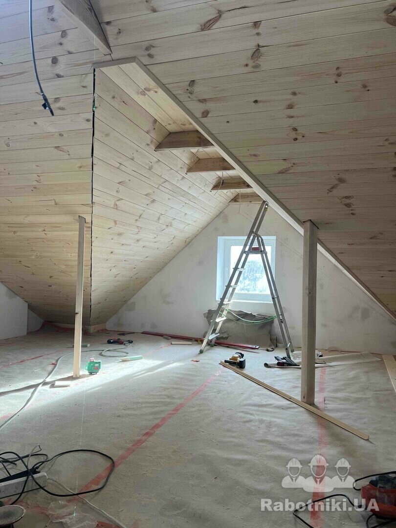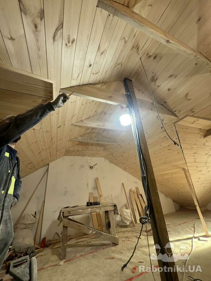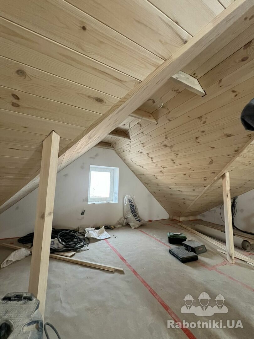Доброго дня усім. Потрібно обшити горище дерев. вагонкою, балки (які видно пошліфувати), кути обшити плінтусами (кутниками/штапіками) будинок 9х7м. Для візуалізації додам декілька фото ідентичного будинку, замовник хоче зробити так само як у сусіда.