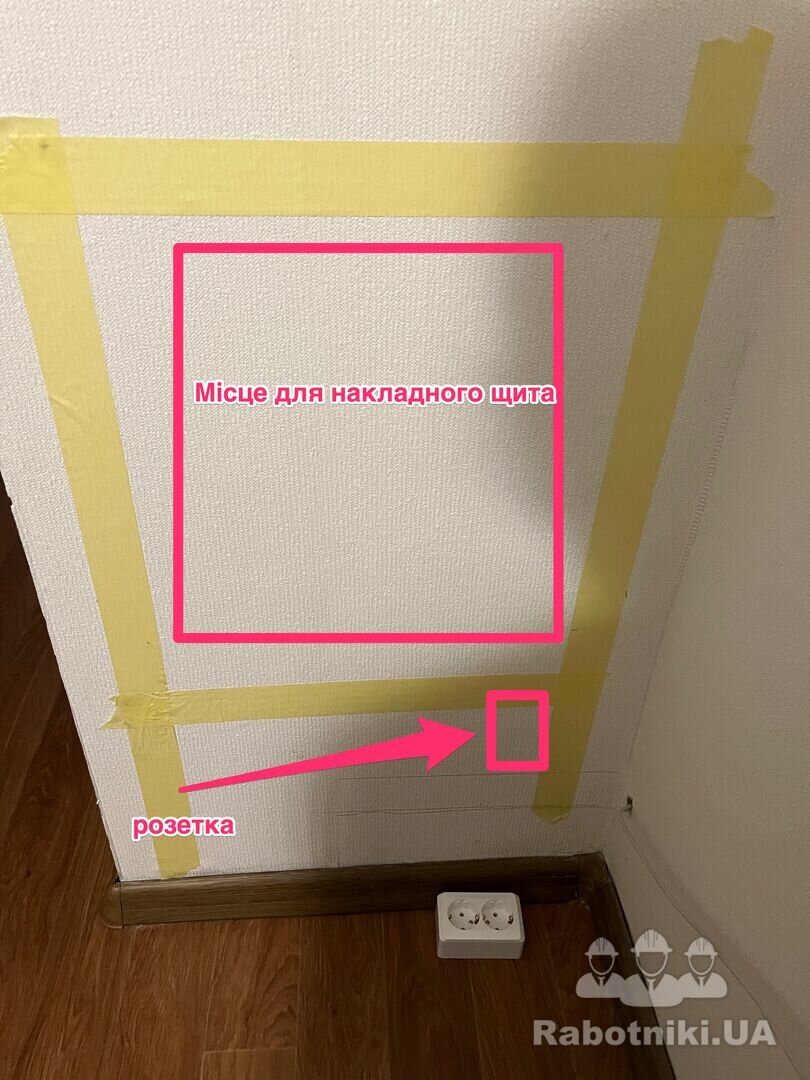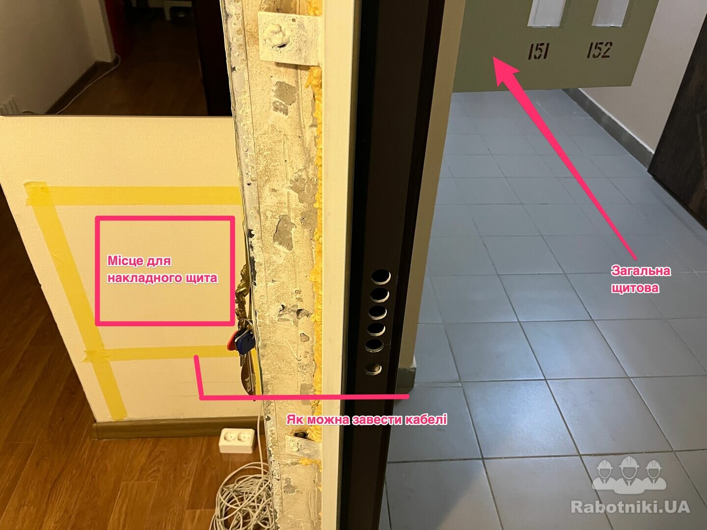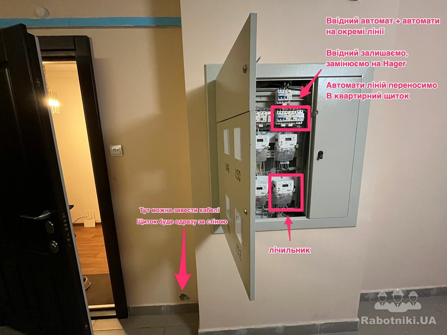 Є вже зібраний новий щит (накладний), який буде встановлено безпосередньо в квартирі. Потрібно перекинути всі лінії з щитової в загальному коридорі, підключити, встановити поряд розетку (також накладну).