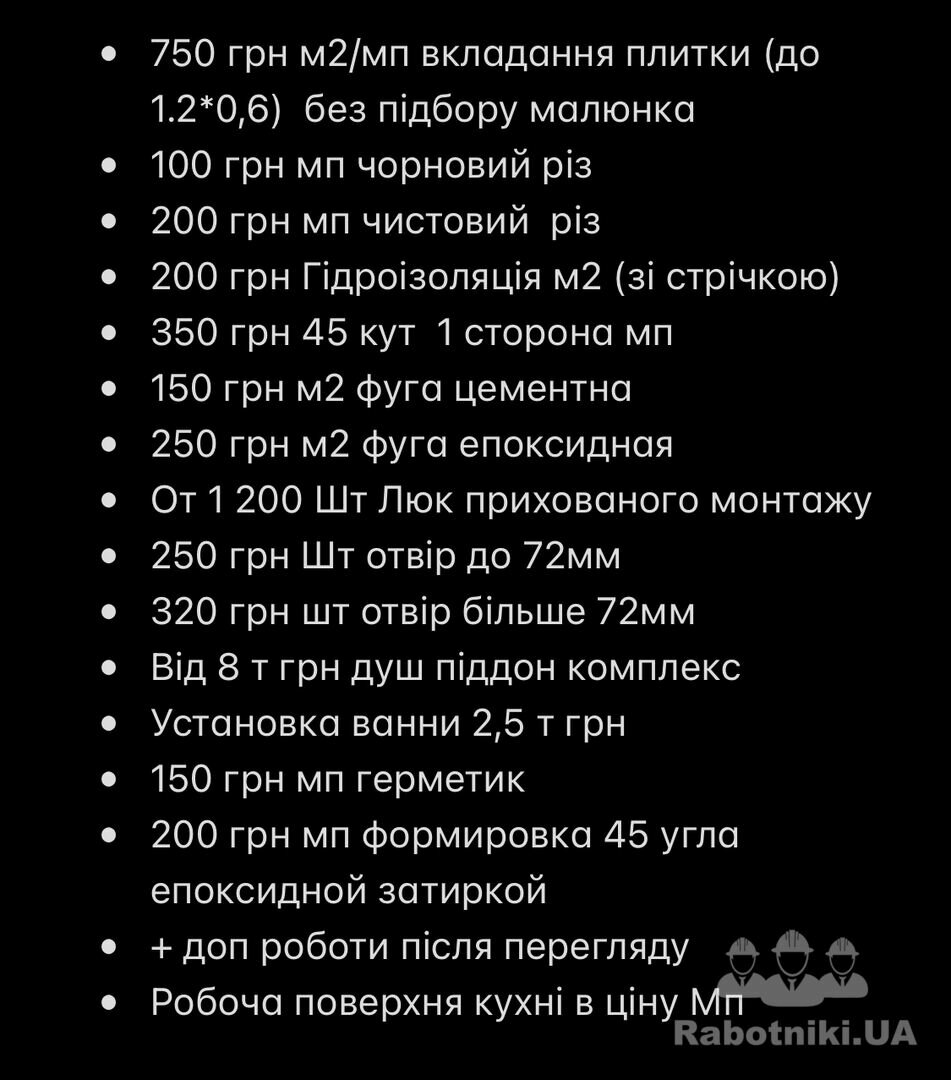 Шукаю спеціаліста для плиточних робіт в кухні, коридорі та санвузлі (підлога, стіни, піддон, фартук). Розмір плитки 120 на 60.