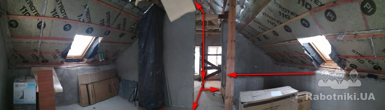 Подшить внутреннюю часть кровли гипсокартоном около 60 м2 Установить перегородки 20 м2