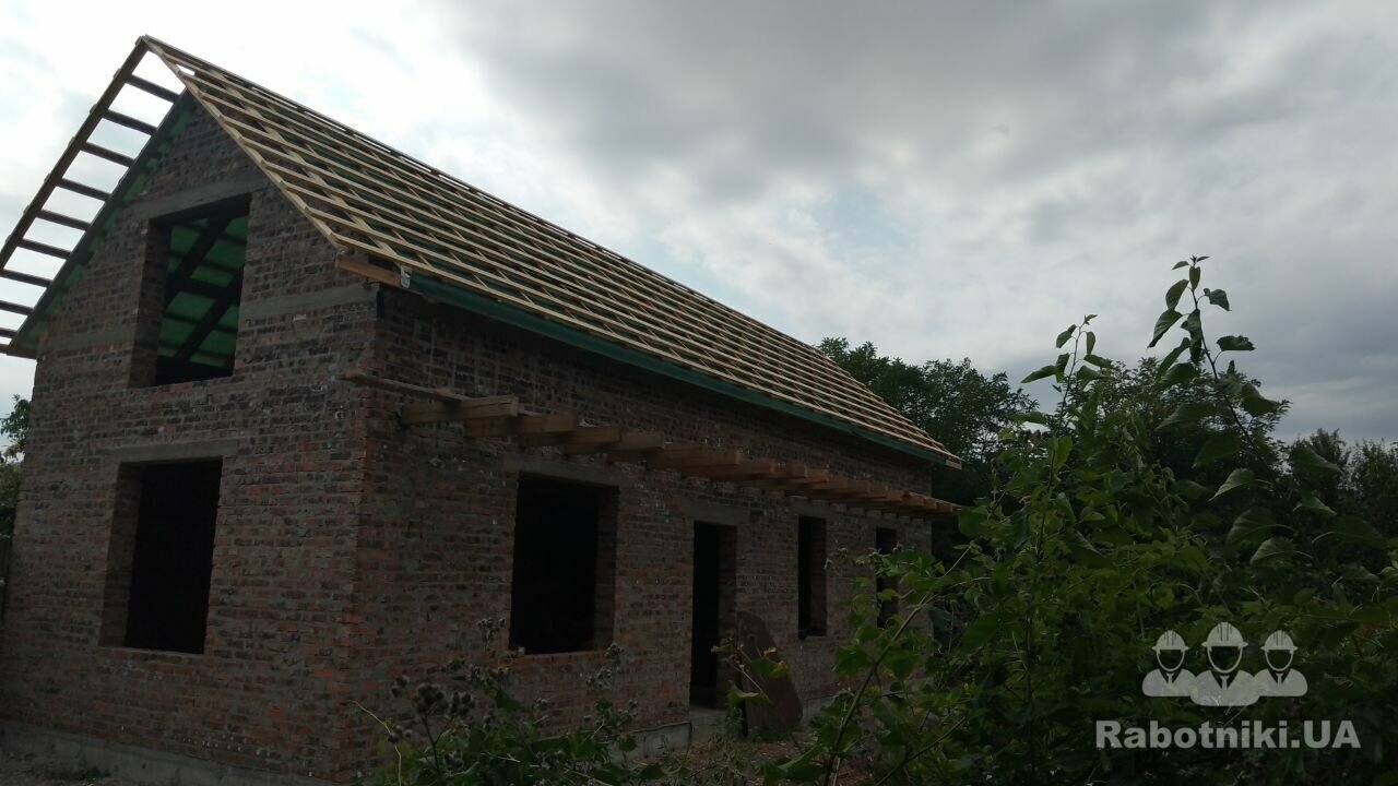 Дах, повністю зібраний, лише не накритий. Накриття профнастил 3.8м, довжина 14.3м рівно 13 листів, без підрізки, 110м2