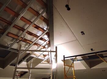 Необходимо смонтироварать гипсокартон на потолок. При монтаже необходимо обойти горизонтальные затяжки (как на фото). Площадь = 100 кв м. Высота от 2-х до 4-х метров.