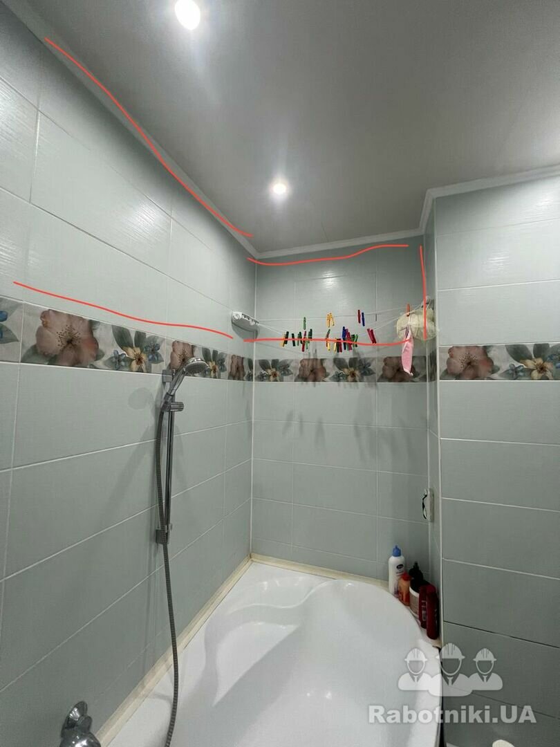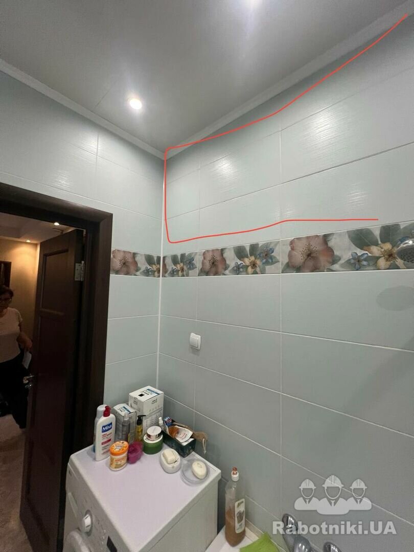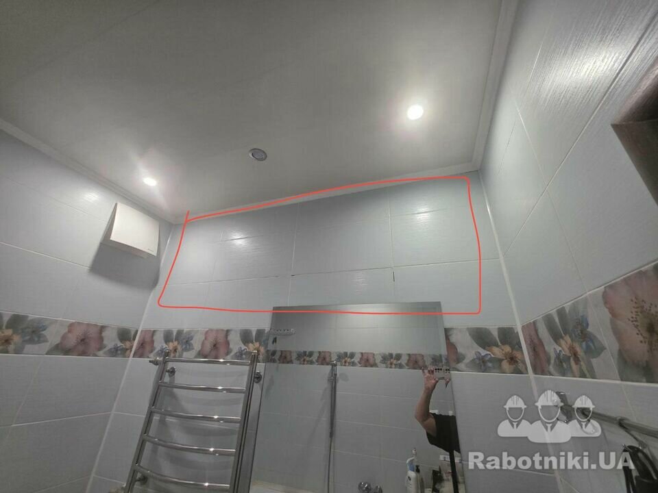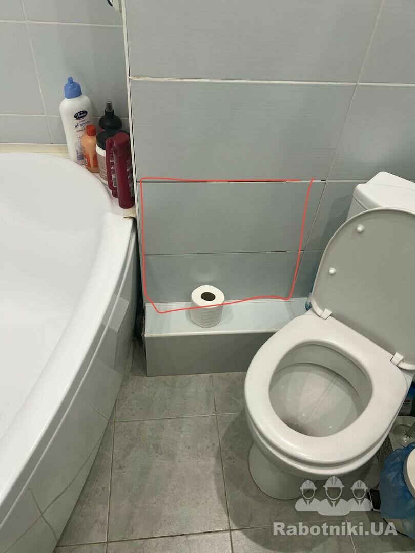 Косметичний ремонт плитки.Потрібно обережно зняти стару плитку(яка бухтить) щоб не задіти іншу плитку.Заміна плитки виділенна червоним на фото. 1)Демонтаж плитки 2000грн. 2)Укладання плитки,монтаж внутрішнього кутику та затирка 8000грн.