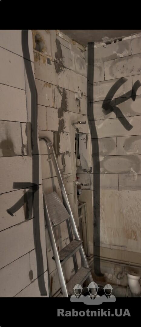 1. Демонтаж та монтаж стіни: Потрібно демонтувати стару перегородку та звести нову з газоблоку (орієнтовний обсяг 30 блоків).