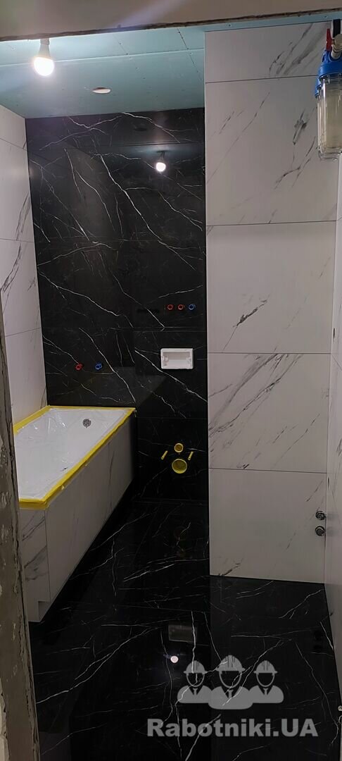 Поттрібно зробити душовий піддон. покласти плитку на стіни та підлогу в кухні та с\у.