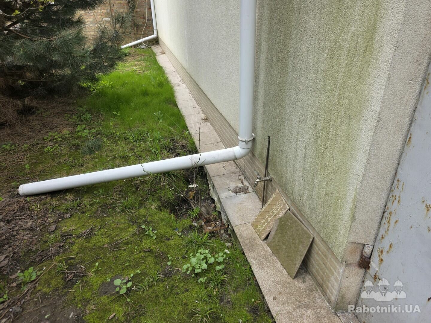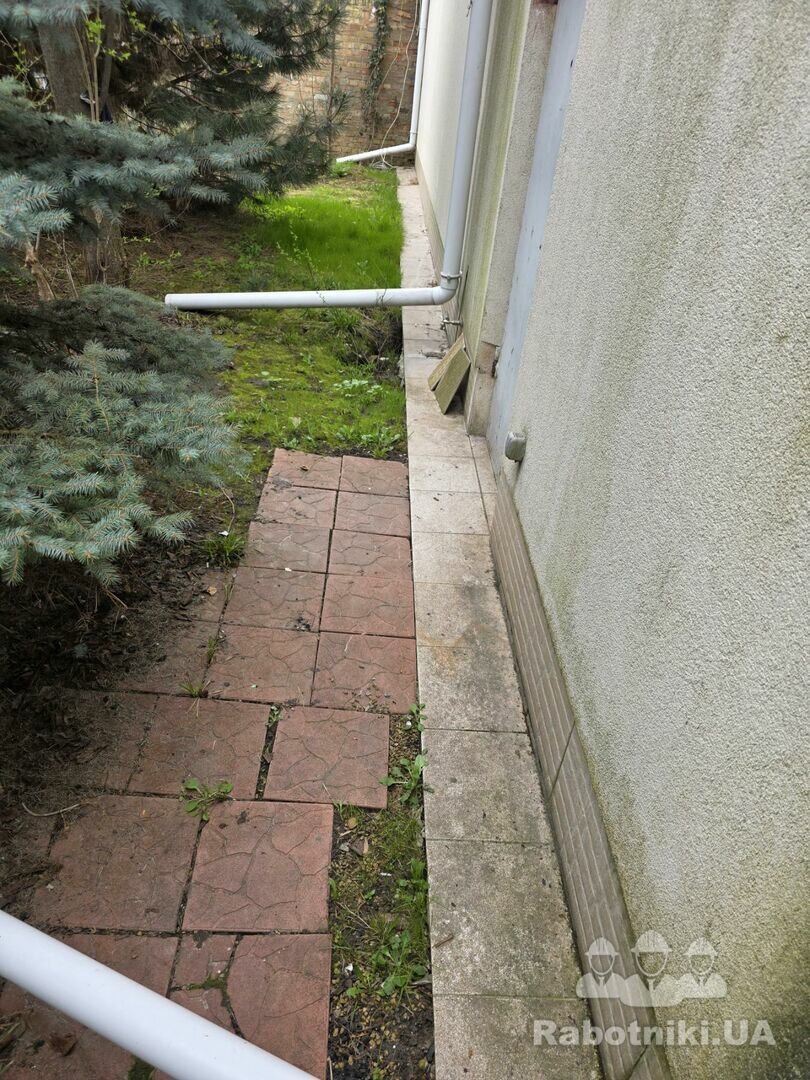 Влаштувати вимощенн вздовж стіни довжиною 15 м шириною 1 м. Зняти ґрунт на глибину 25 30 см, основу вирівняти та ущільнити. Укласти геотекстиль, виконати підсипку щебенем товщиною 10 15 см з ущільненням, зверху влаштувати шар піску 5 10 см з проливом та трамбуванням. Сформувати ухил від будівлі 2 5% (2 5 см на 1 м). Уздовж стіни передбачити деформаційний зазор 10 20 мм із заповненням демпферним матеріалом або герметиком. Виконати фінішне покриття з бетону товщиною 80 100 мм. Забезпечити відведення дощової води від водостічної труби на відстань не менше 1 2 м.